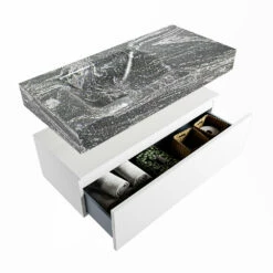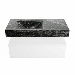 De wastafel is afgewerkt in een marmeren kleur, wat zorgt voor een elegante look. Doordat de wastafel gemaakt is van solid surface, heeft hij een strakke lijnafwerking. Naast de looks, heeft dit sterke materiaal ook veel praktische voordelen. Solid surface is namelijk vochtbestendig en heeft geen poriën waar vuil in kan zitten. Ook is het eenvoudig te reinigen met een natte doek. Mooi én hygiënisch dus!