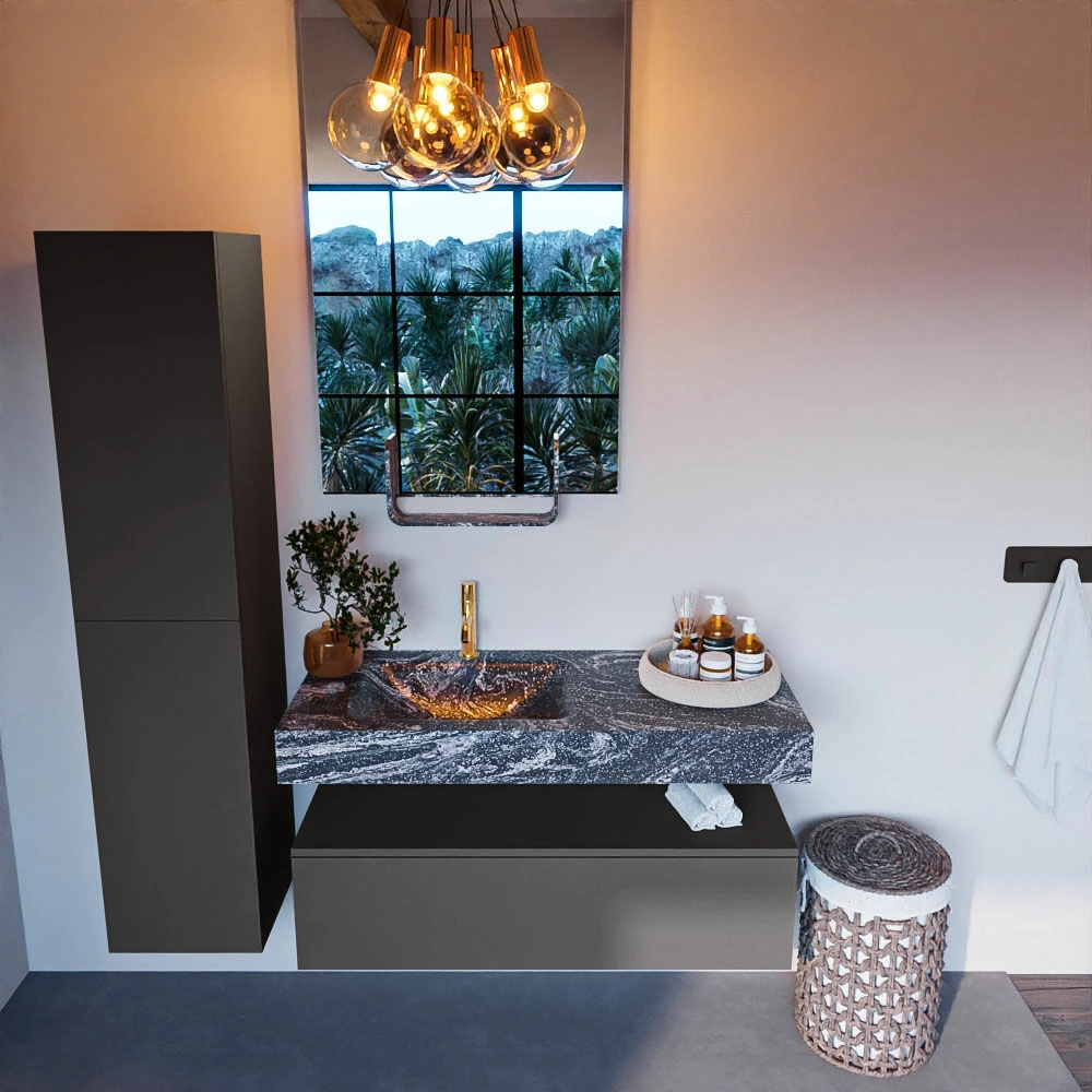 Creëer een stijlvolle look in je badkamer met dit badkamermeubel van Mondiaz. De Alan DLux serie bestaat uit onderkasten en wastafels in meerdere kleuren en verschillende afmetingen. Ook de plaats van de wasbak en het aantal kraangaten varieert, altijd één die perfect in jouw badkamer past dus!