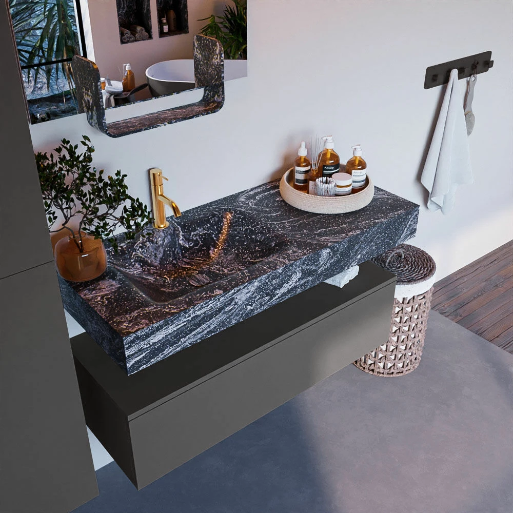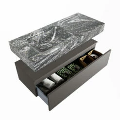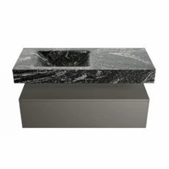 De wastafel is afgewerkt in een marmeren kleur, wat zorgt voor een elegante look. Doordat de wastafel gemaakt is van solid surface, heeft hij een strakke lijnafwerking. Naast de looks, heeft dit sterke materiaal ook veel praktische voordelen. Solid surface is namelijk vochtbestendig en heeft geen poriën waar vuil in kan zitten. Ook is het eenvoudig te reinigen met een natte doek. Mooi én hygiënisch dus!