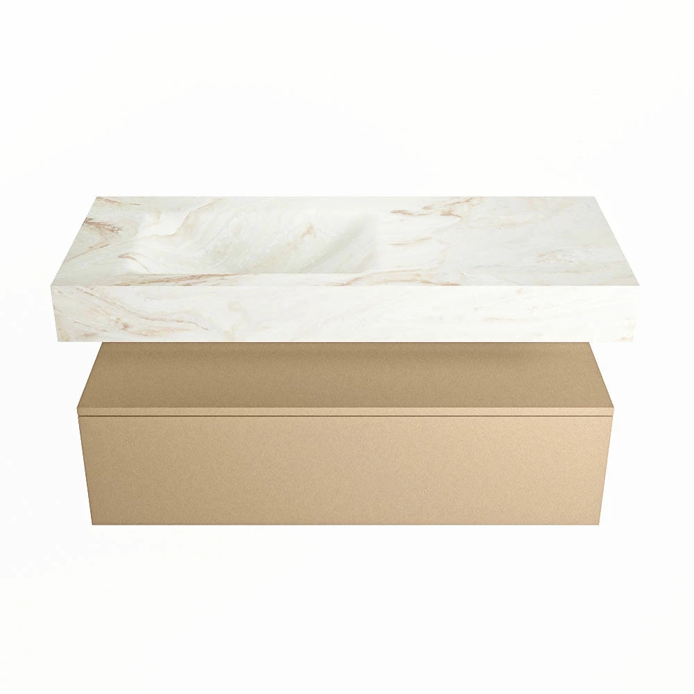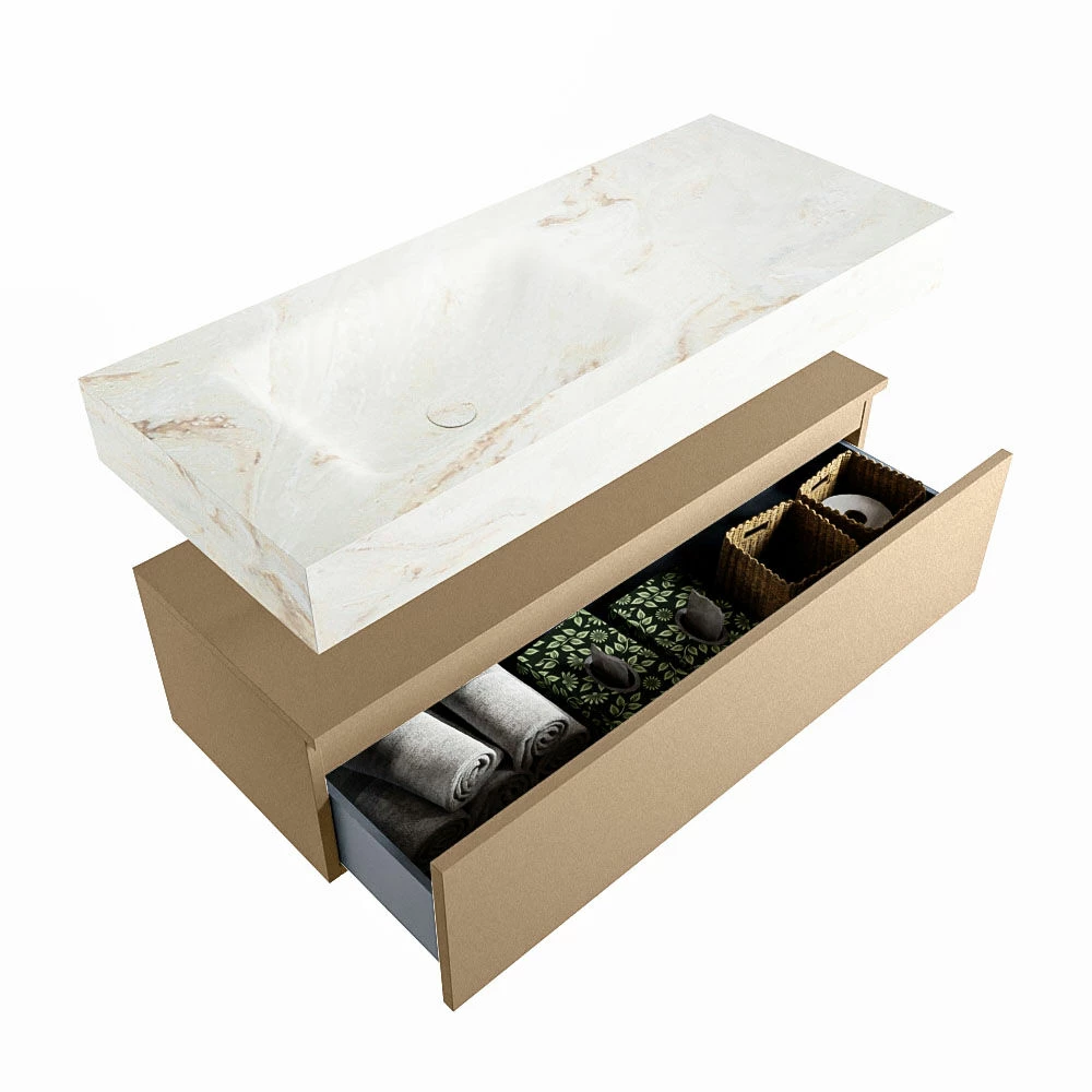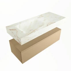 De wastafel is afgewerkt in een marmeren kleur, wat zorgt voor een elegante look. Doordat de wastafel gemaakt is van solid surface, heeft hij een strakke lijnafwerking. Naast de looks, heeft dit sterke materiaal ook veel praktische voordelen. Solid surface is namelijk vochtbestendig en heeft geen poriën waar vuil in kan zitten. Ook is het eenvoudig te reinigen met een natte doek. Mooi én hygiënisch dus!