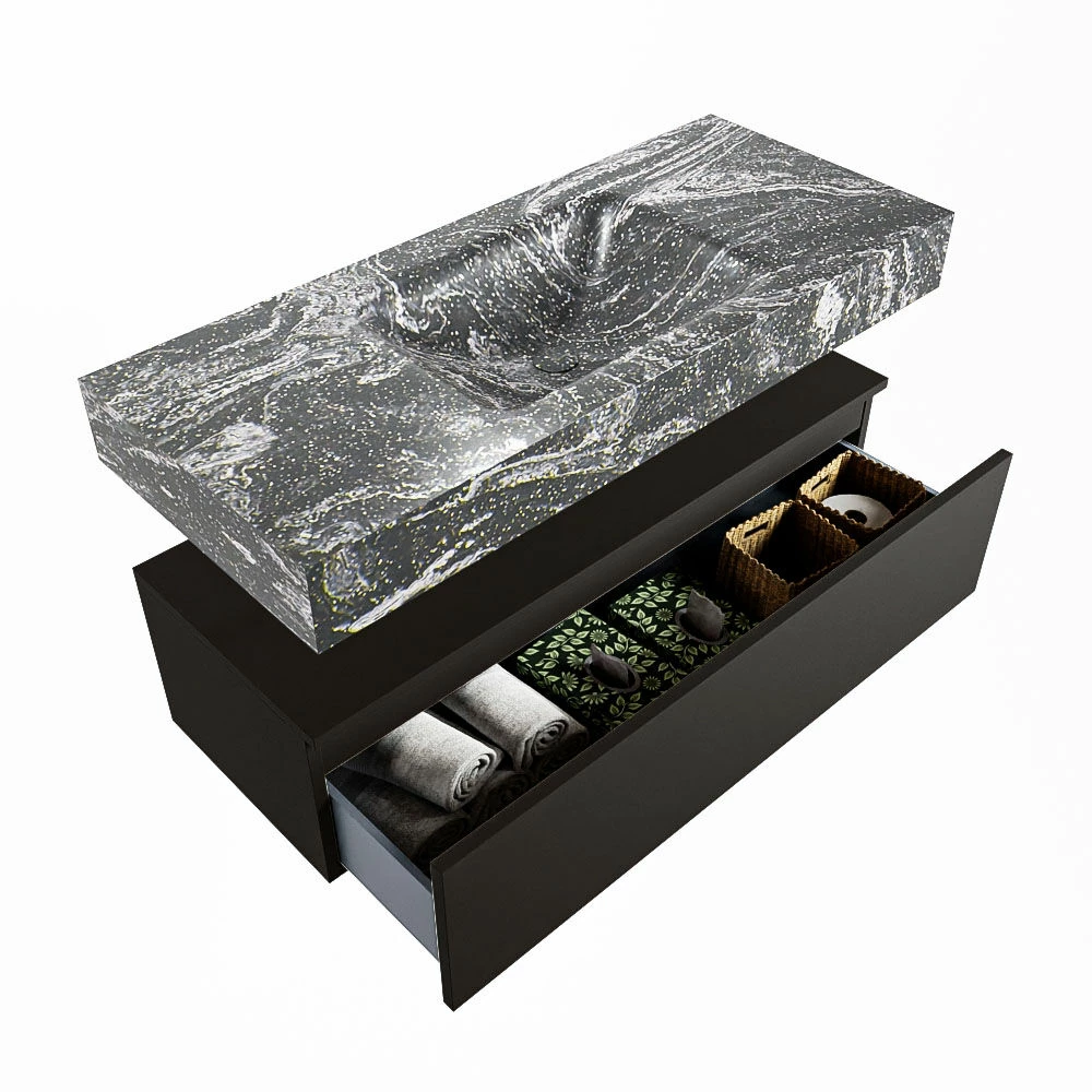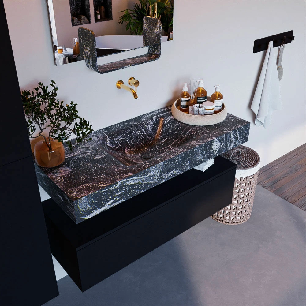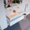 De wastafel is afgewerkt in een marmeren kleur, wat zorgt voor een elegante look. Doordat de wastafel gemaakt is van solid surface, heeft hij een strakke lijnafwerking. Naast de looks, heeft dit sterke materiaal ook veel praktische voordelen. Solid surface is namelijk vochtbestendig en heeft geen poriën waar vuil in kan zitten. Ook is het eenvoudig te reinigen met een natte doek. Mooi én hygiënisch dus!