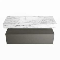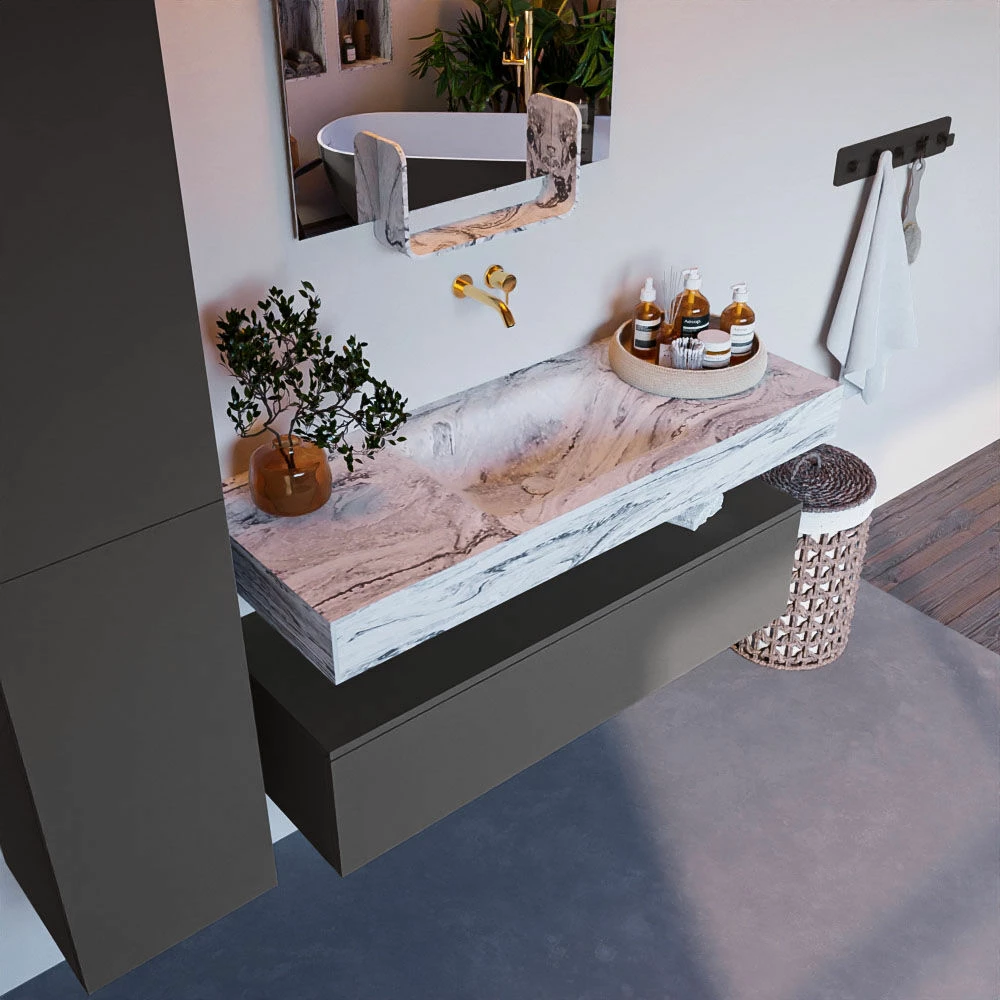 De wastafel is afgewerkt in een marmeren kleur, wat zorgt voor een elegante look. Doordat de wastafel gemaakt is van solid surface, heeft hij een strakke lijnafwerking. Naast de looks, heeft dit sterke materiaal ook veel praktische voordelen. Solid surface is namelijk vochtbestendig en heeft geen poriën waar vuil in kan zitten. Ook is het eenvoudig te reinigen met een natte doek. Mooi én hygiënisch dus!