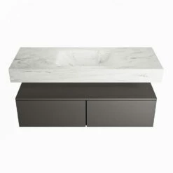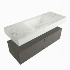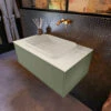 De wastafel is afgewerkt in een marmeren kleur, wat zorgt voor een elegante look. Doordat de wastafel gemaakt is van solid surface, heeft hij een strakke lijnafwerking. Naast de looks, heeft dit sterke materiaal ook veel praktische voordelen. Solid surface is namelijk vochtbestendig en heeft geen poriën waar vuil in kan zitten. Ook is het eenvoudig te reinigen met een natte doek. Mooi én hygiënisch dus!