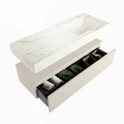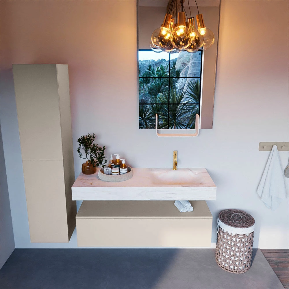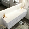 De wastafel is afgewerkt in een marmeren kleur, wat zorgt voor een elegante look. Doordat de wastafel gemaakt is van solid surface, heeft hij een strakke lijnafwerking. Naast de looks, heeft dit sterke materiaal ook veel praktische voordelen. Solid surface is namelijk vochtbestendig en heeft geen poriën waar vuil in kan zitten. Ook is het eenvoudig te reinigen met een natte doek. Mooi én hygiënisch dus!