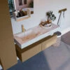 De wastafel is afgewerkt in een marmeren kleur, wat zorgt voor een elegante look. Doordat de wastafel gemaakt is van solid surface, heeft hij een strakke lijnafwerking. Naast de looks, heeft dit sterke materiaal ook veel praktische voordelen. Solid surface is namelijk vochtbestendig en heeft geen poriën waar vuil in kan zitten. Ook is het eenvoudig te reinigen met een natte doek. Mooi én hygiënisch dus!