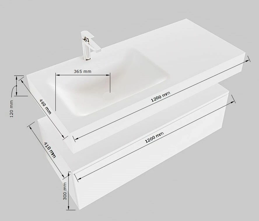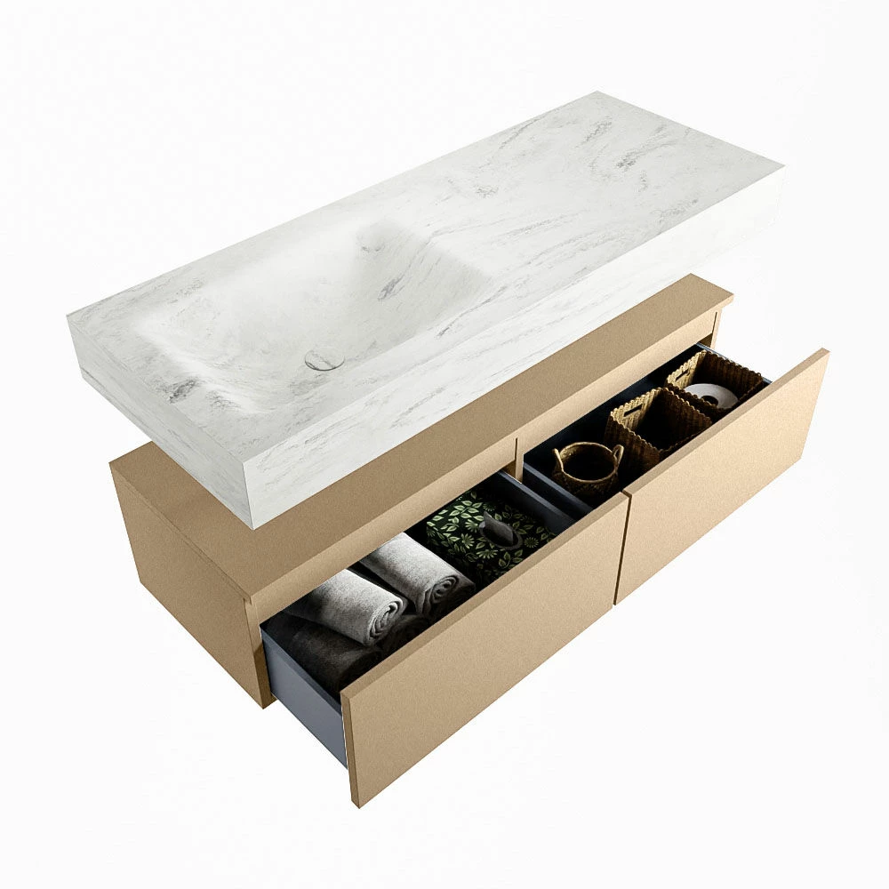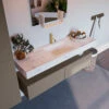 De wastafel is afgewerkt in een marmeren kleur, wat zorgt voor een elegante look. Doordat de wastafel gemaakt is van solid surface, heeft hij een strakke lijnafwerking. Naast de looks, heeft dit sterke materiaal ook veel praktische voordelen. Solid surface is namelijk vochtbestendig en heeft geen poriën waar vuil in kan zitten. Ook is het eenvoudig te reinigen met een natte doek. Mooi én hygiënisch dus!