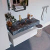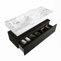 De wastafel is afgewerkt in een marmeren kleur, wat zorgt voor een elegante look. Doordat de wastafel gemaakt is van solid surface, heeft hij een strakke lijnafwerking. Naast de looks, heeft dit sterke materiaal ook veel praktische voordelen. Solid surface is namelijk vochtbestendig en heeft geen poriën waar vuil in kan zitten. Ook is het eenvoudig te reinigen met een natte doek. Mooi én hygiënisch dus!