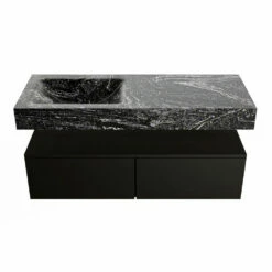 De wastafel is afgewerkt in een marmeren kleur, wat zorgt voor een elegante look. Doordat de wastafel gemaakt is van solid surface, heeft hij een strakke lijnafwerking. Naast de looks, heeft dit sterke materiaal ook veel praktische voordelen. Solid surface is namelijk vochtbestendig en heeft geen poriën waar vuil in kan zitten. Ook is het eenvoudig te reinigen met een natte doek. Mooi én hygiënisch dus!