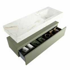 De wastafel is afgewerkt in een marmeren kleur, wat zorgt voor een elegante look. Doordat de wastafel gemaakt is van solid surface, heeft hij een strakke lijnafwerking. Naast de looks, heeft dit sterke materiaal ook veel praktische voordelen. Solid surface is namelijk vochtbestendig en heeft geen poriën waar vuil in kan zitten. Ook is het eenvoudig te reinigen met een natte doek. Mooi én hygiënisch dus!