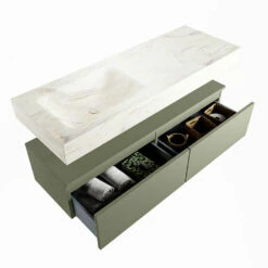 Creëer een stijlvolle look in je badkamer met dit badkamermeubel van Mondiaz. De Alan DLux serie bestaat uit onderkasten en wastafels in meerdere kleuren en verschillende afmetingen. Ook de plaats van de wasbak en het aantal kraangaten varieert, altijd één die perfect in jouw badkamer past dus!