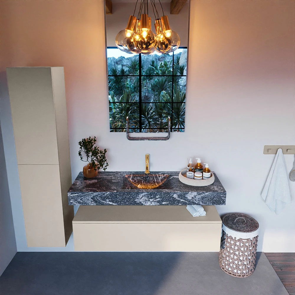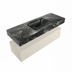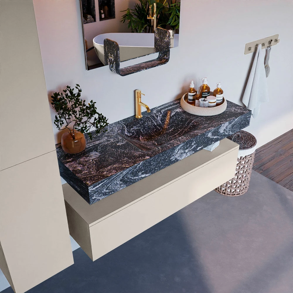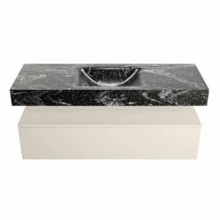 De wastafel is afgewerkt in een marmeren kleur, wat zorgt voor een elegante look. Doordat de wastafel gemaakt is van solid surface, heeft hij een strakke lijnafwerking. Naast de looks, heeft dit sterke materiaal ook veel praktische voordelen. Solid surface is namelijk vochtbestendig en heeft geen poriën waar vuil in kan zitten. Ook is het eenvoudig te reinigen met een natte doek. Mooi én hygiënisch dus!