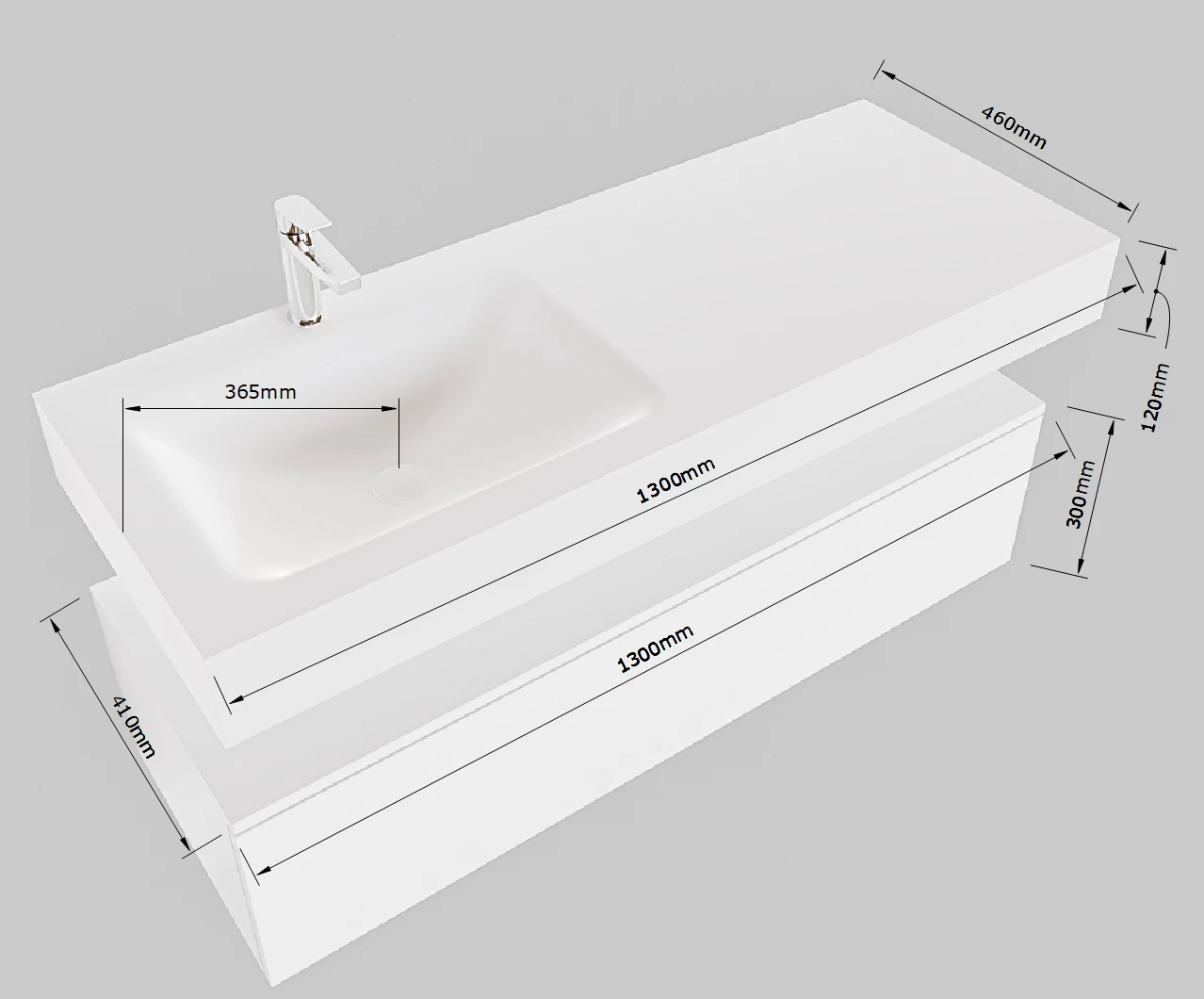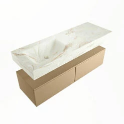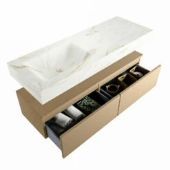 De wastafel is afgewerkt in een marmeren kleur, wat zorgt voor een elegante look. Doordat de wastafel gemaakt is van solid surface, heeft hij een strakke lijnafwerking. Naast de looks, heeft dit sterke materiaal ook veel praktische voordelen. Solid surface is namelijk vochtbestendig en heeft geen poriën waar vuil in kan zitten. Ook is het eenvoudig te reinigen met een natte doek. Mooi én hygiënisch dus!
