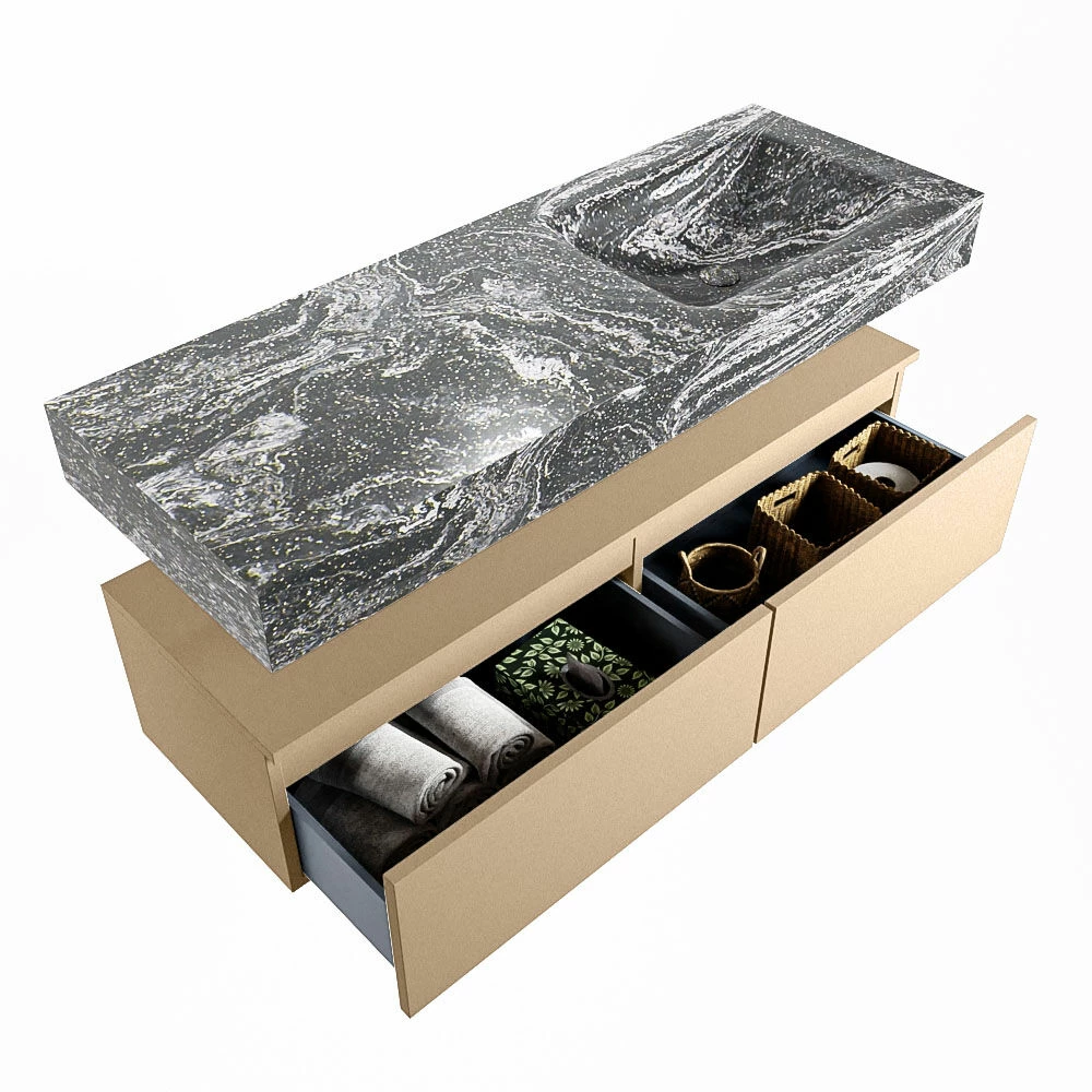 De wastafel is afgewerkt in een marmeren kleur, wat zorgt voor een elegante look. Doordat de wastafel gemaakt is van solid surface, heeft hij een strakke lijnafwerking. Naast de looks, heeft dit sterke materiaal ook veel praktische voordelen. Solid surface is namelijk vochtbestendig en heeft geen poriën waar vuil in kan zitten. Ook is het eenvoudig te reinigen met een natte doek. Mooi én hygiënisch dus!
