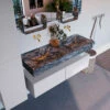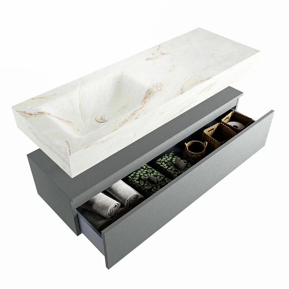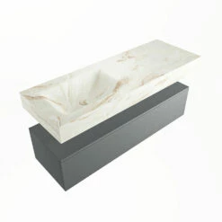 De wastafel is afgewerkt in een marmeren kleur, wat zorgt voor een elegante look. Doordat de wastafel gemaakt is van solid surface, heeft hij een strakke lijnafwerking. Naast de looks, heeft dit sterke materiaal ook veel praktische voordelen. Solid surface is namelijk vochtbestendig en heeft geen poriën waar vuil in kan zitten. Ook is het eenvoudig te reinigen met een natte doek. Mooi én hygiënisch dus!