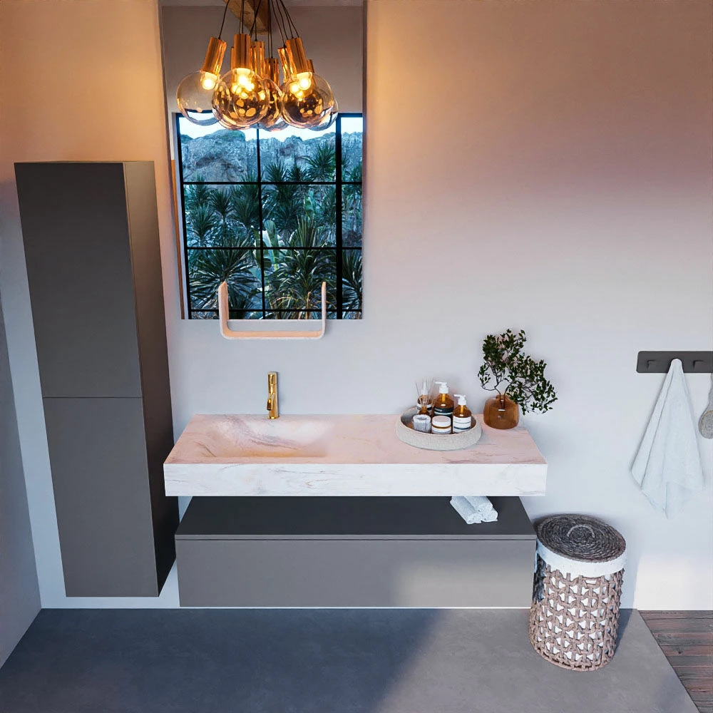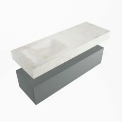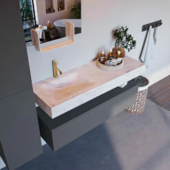 De wastafel is afgewerkt in een marmeren kleur, wat zorgt voor een elegante look. Doordat de wastafel gemaakt is van solid surface, heeft hij een strakke lijnafwerking. Naast de looks, heeft dit sterke materiaal ook veel praktische voordelen. Solid surface is namelijk vochtbestendig en heeft geen poriën waar vuil in kan zitten. Ook is het eenvoudig te reinigen met een natte doek. Mooi én hygiënisch dus!
