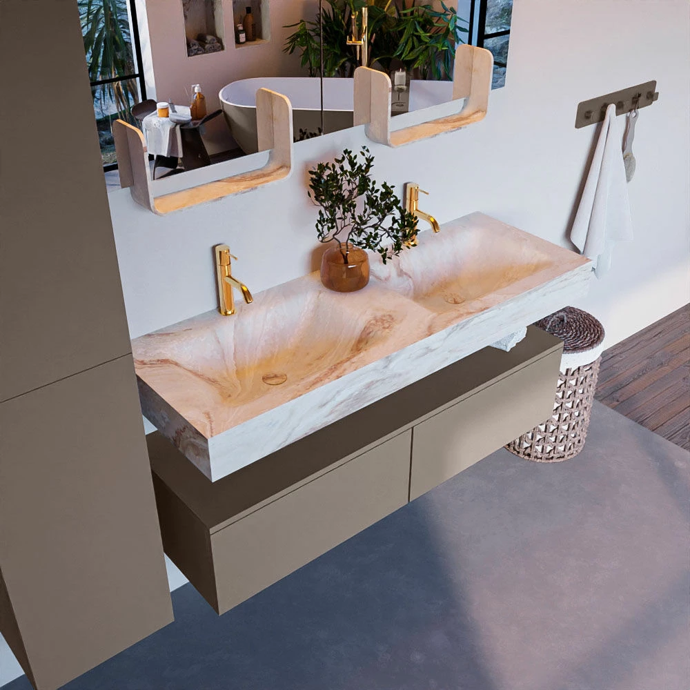 Creëer een stijlvolle look in je badkamer met dit badkamermeubel van Mondiaz. De Alan DLux serie bestaat uit onderkasten en wastafels in meerdere kleuren en verschillende afmetingen. Ook de plaats van de wasbak en het aantal kraangaten varieert, altijd één die perfect in jouw badkamer past dus!