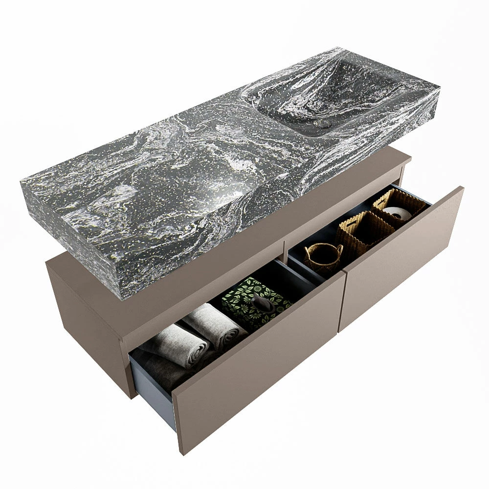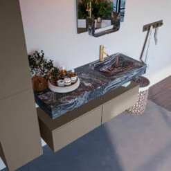 De wastafel is afgewerkt in een marmeren kleur, wat zorgt voor een elegante look. Doordat de wastafel gemaakt is van solid surface, heeft hij een strakke lijnafwerking. Naast de looks, heeft dit sterke materiaal ook veel praktische voordelen. Solid surface is namelijk vochtbestendig en heeft geen poriën waar vuil in kan zitten. Ook is het eenvoudig te reinigen met een natte doek. Mooi én hygiënisch dus!