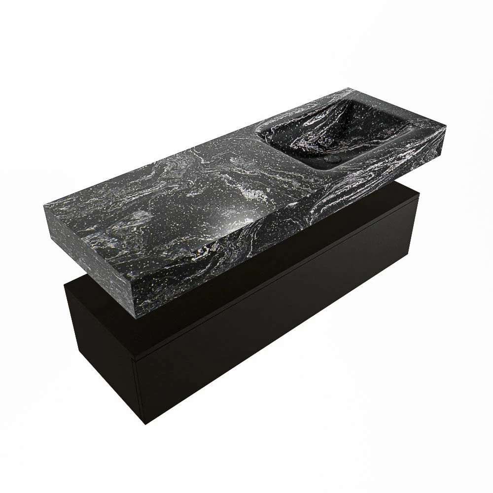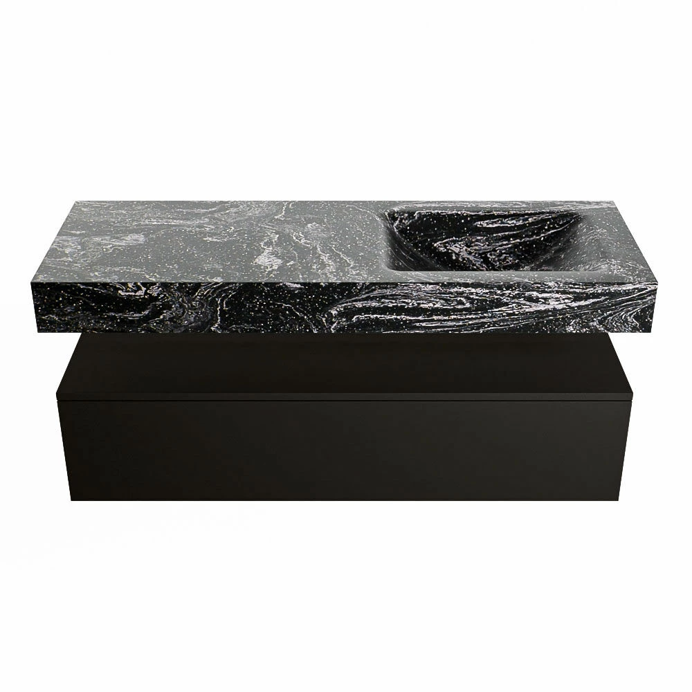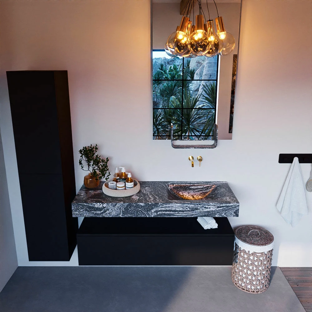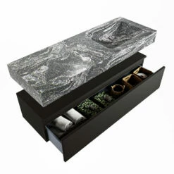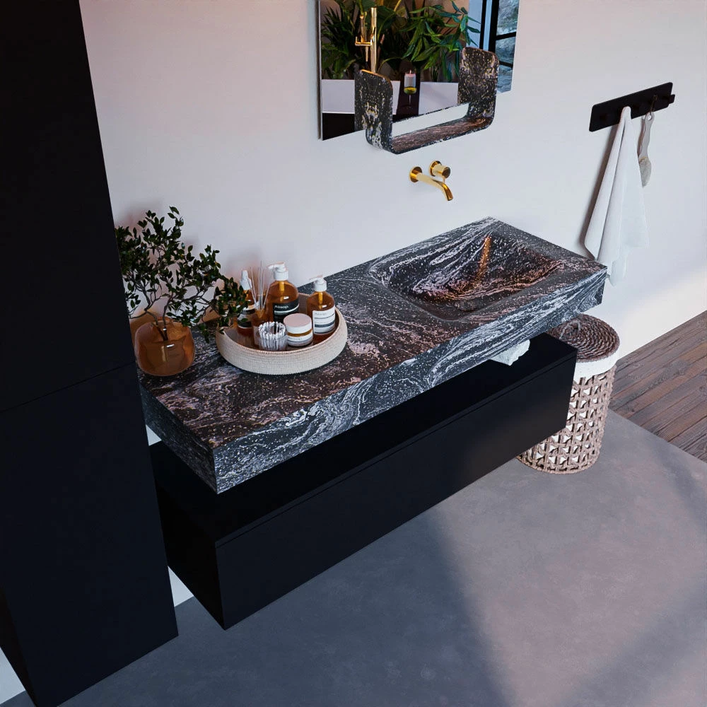 De wastafel is afgewerkt in een marmeren kleur, wat zorgt voor een elegante look. Doordat de wastafel gemaakt is van solid surface, heeft hij een strakke lijnafwerking. Naast de looks, heeft dit sterke materiaal ook veel praktische voordelen. Solid surface is namelijk vochtbestendig en heeft geen poriën waar vuil in kan zitten. Ook is het eenvoudig te reinigen met een natte doek. Mooi én hygiënisch dus!