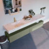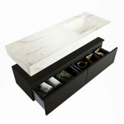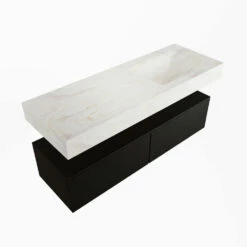 De wastafel is afgewerkt in een marmeren kleur, wat zorgt voor een elegante look. Doordat de wastafel gemaakt is van solid surface, heeft hij een strakke lijnafwerking. Naast de looks, heeft dit sterke materiaal ook veel praktische voordelen. Solid surface is namelijk vochtbestendig en heeft geen poriën waar vuil in kan zitten. Ook is het eenvoudig te reinigen met een natte doek. Mooi én hygiënisch dus!