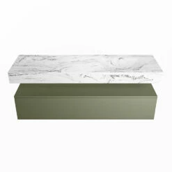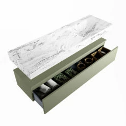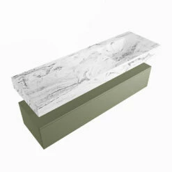 De wastafel is afgewerkt in een marmeren kleur, wat zorgt voor een elegante look. Doordat de wastafel gemaakt is van solid surface, heeft hij een strakke lijnafwerking. Naast de looks, heeft dit sterke materiaal ook veel praktische voordelen. Solid surface is namelijk vochtbestendig en heeft geen poriën waar vuil in kan zitten. Ook is het eenvoudig te reinigen met een natte doek. Mooi én hygiënisch dus!