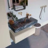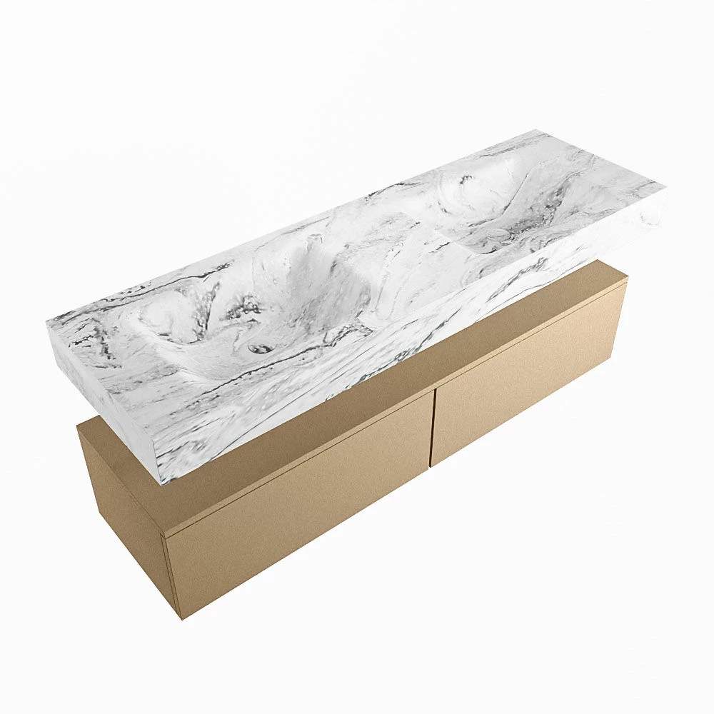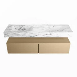 De wastafel is afgewerkt in een marmeren kleur, wat zorgt voor een elegante look. Doordat de wastafel gemaakt is van solid surface, heeft hij een strakke lijnafwerking. Naast de looks, heeft dit sterke materiaal ook veel praktische voordelen. Solid surface is namelijk vochtbestendig en heeft geen poriën waar vuil in kan zitten. Ook is het eenvoudig te reinigen met een natte doek. Mooi én hygiënisch dus!