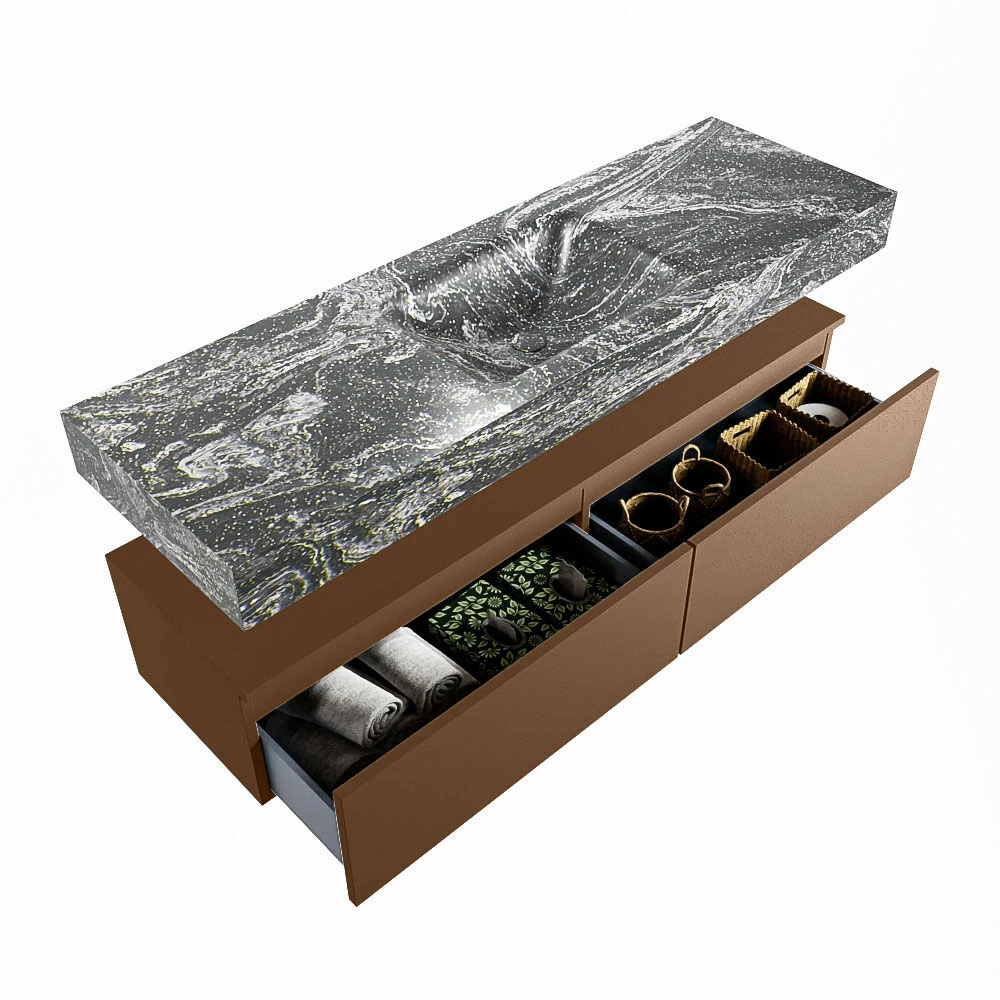 De wastafel is afgewerkt in een marmeren kleur, wat zorgt voor een elegante look. Doordat de wastafel gemaakt is van solid surface, heeft hij een strakke lijnafwerking. Naast de looks, heeft dit sterke materiaal ook veel praktische voordelen. Solid surface is namelijk vochtbestendig en heeft geen poriën waar vuil in kan zitten. Ook is het eenvoudig te reinigen met een natte doek. Mooi én hygiënisch dus!
