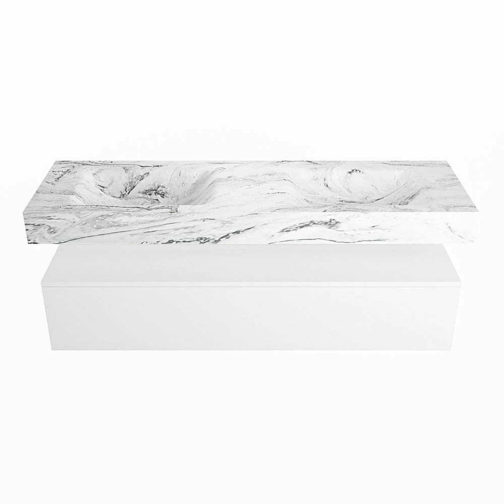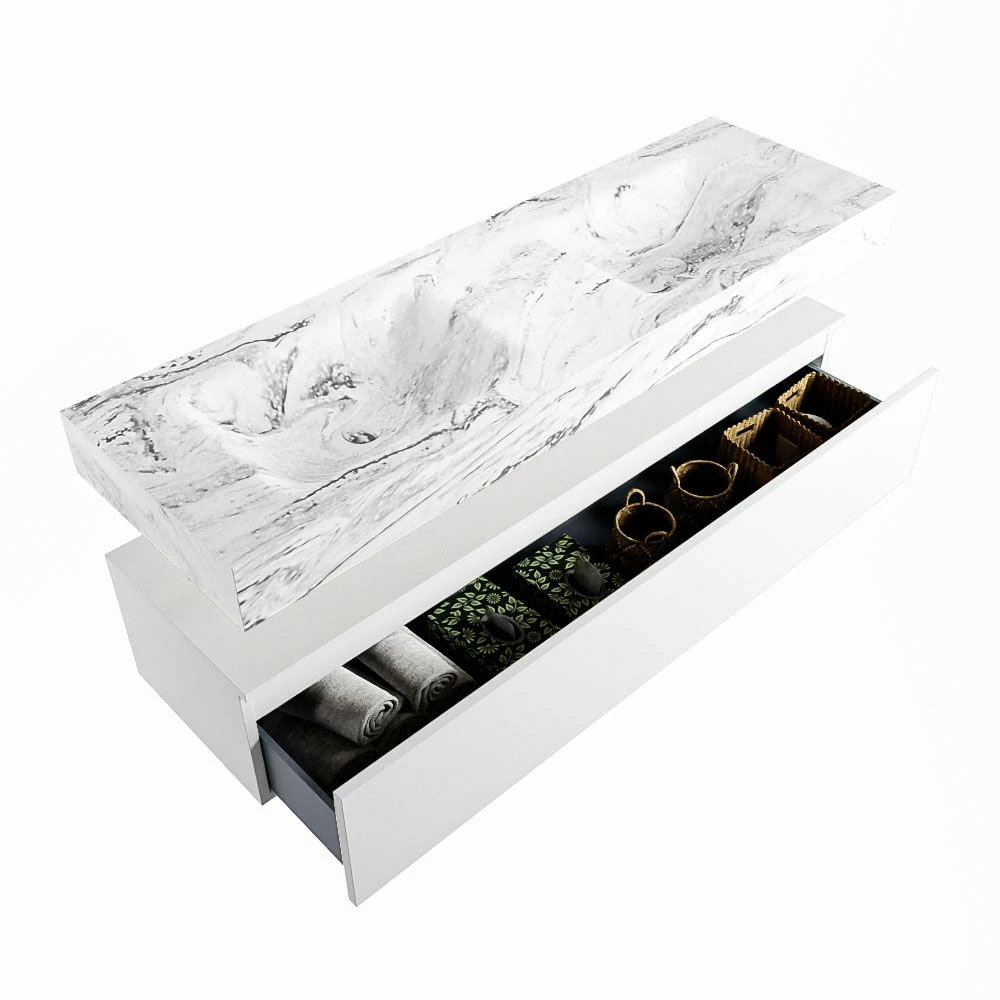 De wastafel is afgewerkt in een marmeren kleur, wat zorgt voor een elegante look. Doordat de wastafel gemaakt is van solid surface, heeft hij een strakke lijnafwerking. Naast de looks, heeft dit sterke materiaal ook veel praktische voordelen. Solid surface is namelijk vochtbestendig en heeft geen poriën waar vuil in kan zitten. Ook is het eenvoudig te reinigen met een natte doek. Mooi én hygiënisch dus!