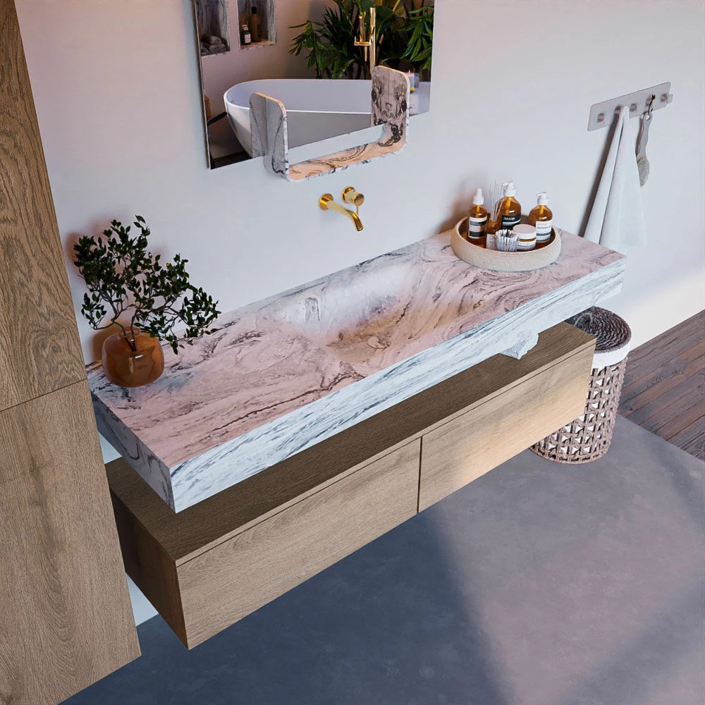 De wastafel is afgewerkt in een marmeren kleur, wat zorgt voor een elegante look. Doordat de wastafel gemaakt is van solid surface, heeft hij een strakke lijnafwerking. Naast de looks, heeft dit sterke materiaal ook veel praktische voordelen. Solid surface is namelijk vochtbestendig en heeft geen poriën waar vuil in kan zitten. Ook is het eenvoudig te reinigen met een natte doek. Mooi én hygiënisch dus!