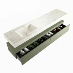 De wastafel is afgewerkt in een marmeren kleur, wat zorgt voor een elegante look. Doordat de wastafel gemaakt is van solid surface, heeft hij een strakke lijnafwerking. Naast de looks, heeft dit sterke materiaal ook veel praktische voordelen. Solid surface is namelijk vochtbestendig en heeft geen poriën waar vuil in kan zitten. Ook is het eenvoudig te reinigen met een natte doek. Mooi én hygiënisch dus!