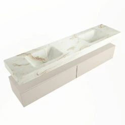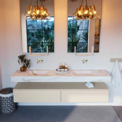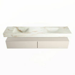 De wastafel is afgewerkt in een marmeren kleur, wat zorgt voor een elegante look. Doordat de wastafel gemaakt is van solid surface, heeft hij een strakke lijnafwerking. Naast de looks, heeft dit sterke materiaal ook veel praktische voordelen. Solid surface is namelijk vochtbestendig en heeft geen poriën waar vuil in kan zitten. Ook is het eenvoudig te reinigen met een natte doek. Mooi én hygiënisch dus!