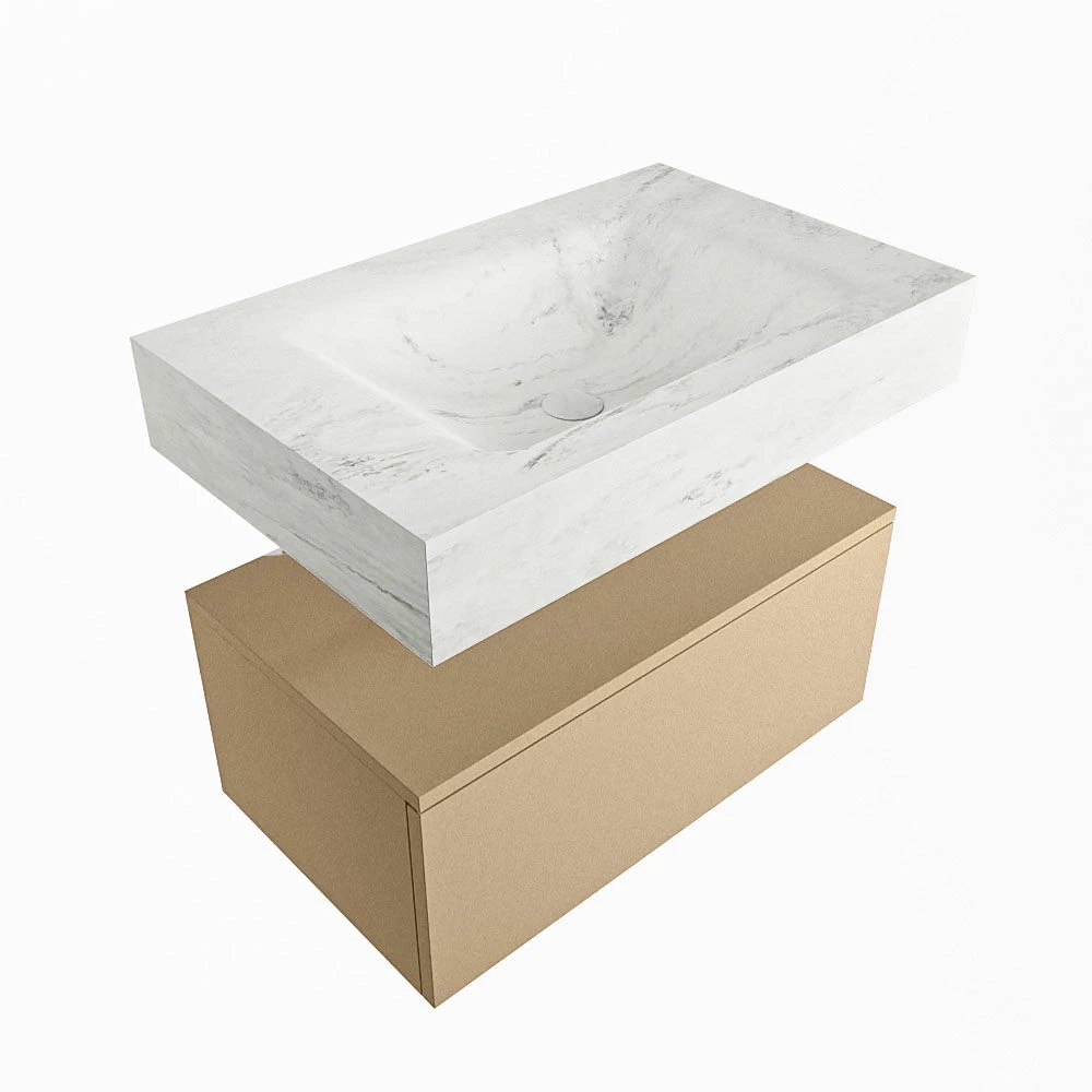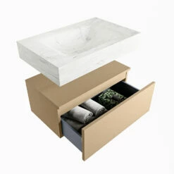 De wastafel is afgewerkt in een marmeren kleur, wat zorgt voor een elegante look. Doordat de wastafel gemaakt is van solid surface, heeft hij een strakke lijnafwerking. Naast de looks, heeft dit sterke materiaal ook veel praktische voordelen. Solid surface is namelijk vochtbestendig en heeft geen poriën waar vuil in kan zitten. Ook is het eenvoudig te reinigen met een natte doek. Mooi én hygiënisch dus!