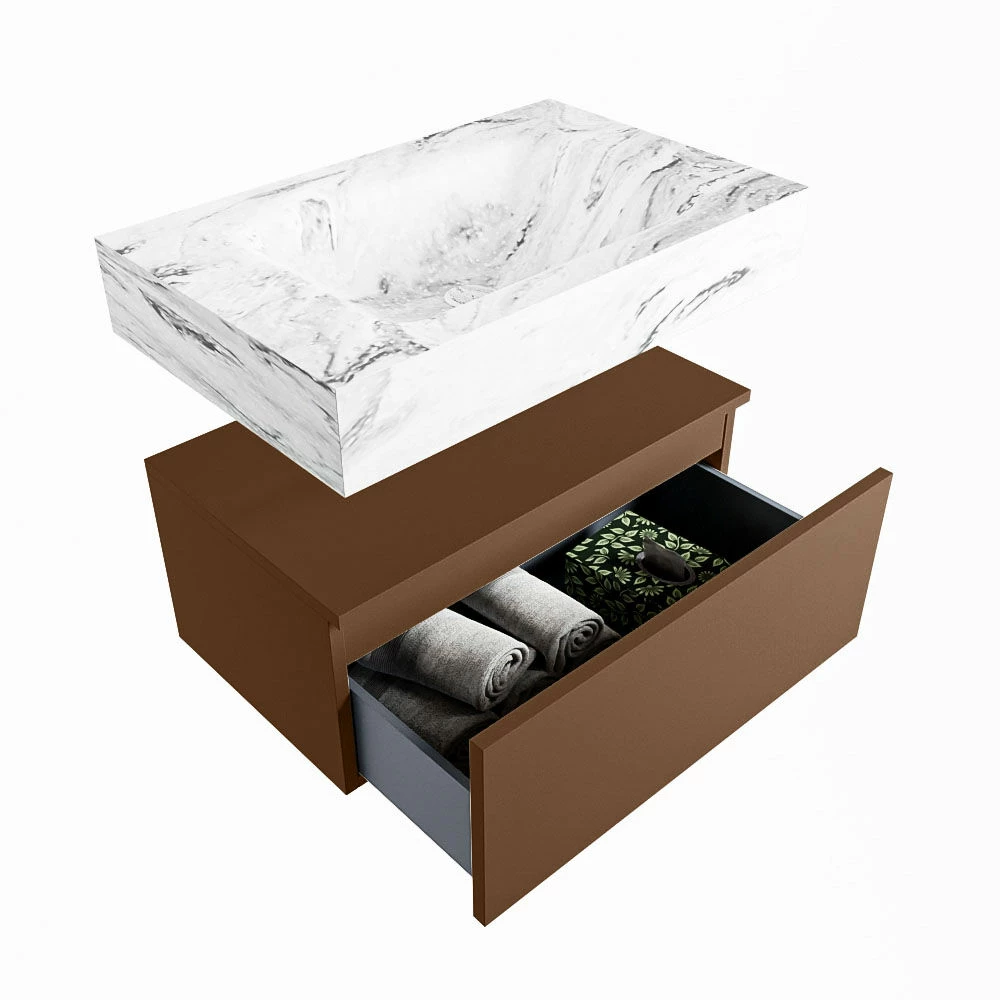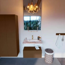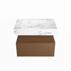 De wastafel is afgewerkt in een marmeren kleur, wat zorgt voor een elegante look. Doordat de wastafel gemaakt is van solid surface, heeft hij een strakke lijnafwerking. Naast de looks, heeft dit sterke materiaal ook veel praktische voordelen. Solid surface is namelijk vochtbestendig en heeft geen poriën waar vuil in kan zitten. Ook is het eenvoudig te reinigen met een natte doek. Mooi én hygiënisch dus!