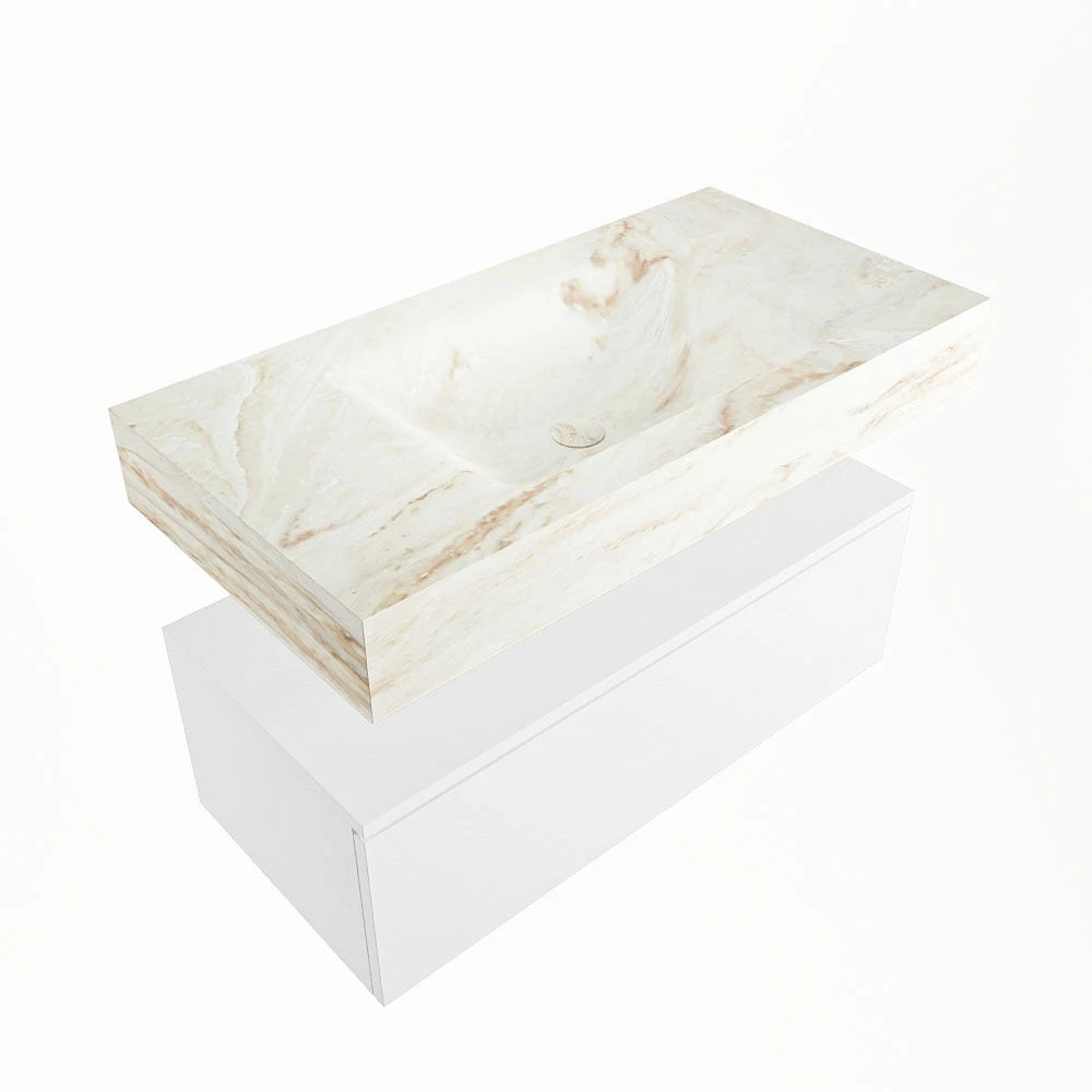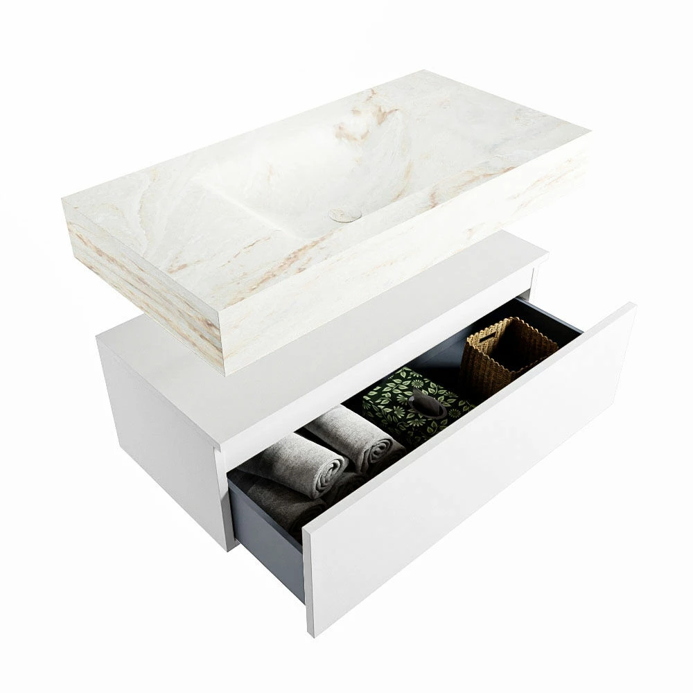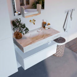 De wastafel is afgewerkt in een marmeren kleur, wat zorgt voor een elegante look. Doordat de wastafel gemaakt is van solid surface, heeft hij een strakke lijnafwerking. Naast de looks, heeft dit sterke materiaal ook veel praktische voordelen. Solid surface is namelijk vochtbestendig en heeft geen poriën waar vuil in kan zitten. Ook is het eenvoudig te reinigen met een natte doek. Mooi én hygiënisch dus!
