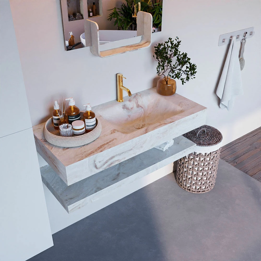 De wastafel is afgewerkt in een marmeren kleur, wat zorgt voor een elegante look. Doordat de wastafel gemaakt is van solid surface, heeft hij een strakke lijnafwerking. Naast de looks, heeft dit sterke materiaal ook veel praktische voordelen. Solid surface is namelijk vochtbestendig en heeft geen poriën waar vuil in kan zitten. Ook is het eenvoudig te reinigen met een natte doek. Mooi én hygiënisch dus!
