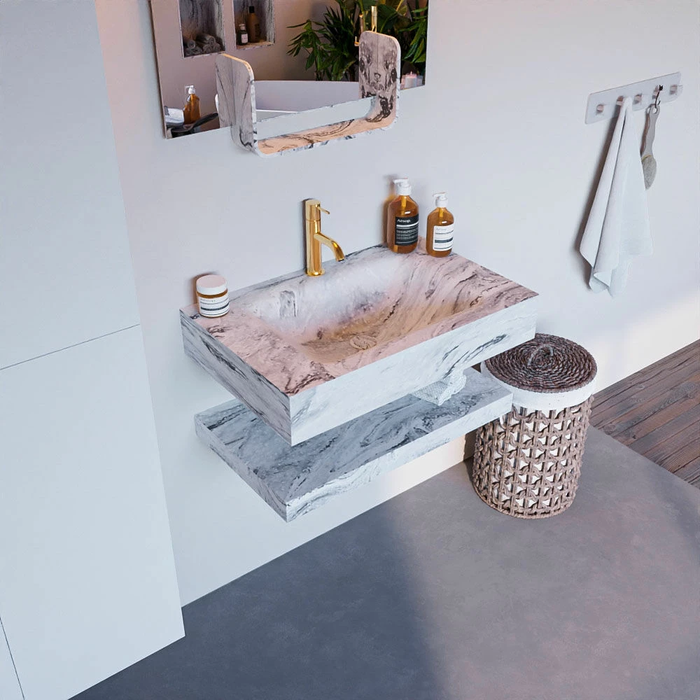 De wastafel is afgewerkt in een marmeren kleur, wat zorgt voor een elegante look. Doordat de wastafel gemaakt is van solid surface, heeft hij een strakke lijnafwerking. Naast de looks, heeft dit sterke materiaal ook veel praktische voordelen. Solid surface is namelijk vochtbestendig en heeft geen poriën waar vuil in kan zitten. Ook is het eenvoudig te reinigen met een natte doek. Mooi én hygiënisch dus!