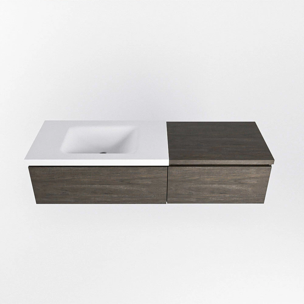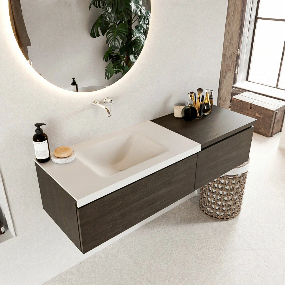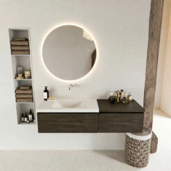 Het badmeubel Bukla combineert een Solid Surface wastafel met een top blad in 2 houttinten. Je hebt zo een mooie scheiding van het natte gedeelte met daar tussen of ernaast een mooie houttint wat veel sfeer en warmte geeft aan de badkamer. Met het Bukla badkamermeubel kun je eindeloos veel variaties maken en met al deze mogelijkheden maak je jouw eigen unieke blikvanger.