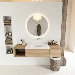 Het badmeubel Bukla combineert een Solid Surface wastafel met een top blad in 2 houttinten. Je hebt zo een mooie scheiding van het natte gedeelte met daar tussen of ernaast een mooie houttint wat veel sfeer en warmte geeft aan de badkamer. Met het Bukla badkamermeubel kun je eindeloos veel variaties maken en met al deze mogelijkheden maak je jouw eigen unieke blikvanger.