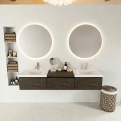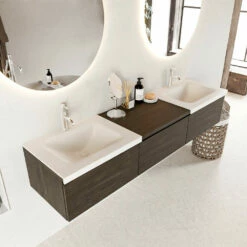 Het badmeubel Bukla combineert een Solid Surface wastafel met een top blad in 2 houttinten. Je hebt zo een mooie scheiding van het natte gedeelte met daar tussen of ernaast een mooie houttint wat veel sfeer en warmte geeft aan de badkamer. Met het Bukla badkamermeubel kun je eindeloos veel variaties maken en met al deze mogelijkheden maak je jouw eigen unieke blikvanger.
