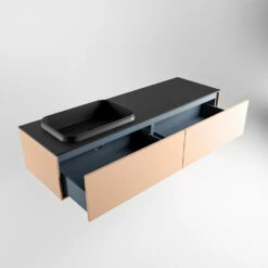 Eenvoud en elegantie, dat is de perfecte omschrijving voor de prachtige meubel set Erin 150 in de kleur Army! De inleg wastafel heeft een opstaande rand met een extra grote en diepe waskom. De ronde vormen van de waskom stralen een luxe zachtheid uit. De plek van de wastafelkraan op de hoek van de waskom geeft een extra speels effect. Het badmeubel van de set Erin heeft een push to open lade. Zo heeft het badmeubel een mooie en gestroomlijnde uitstraling passend in elke badkamerstijl. Het badmeubel op deze afbeeldingen is de Erin 150cm met onderkast in de kleur Army met 1 lades. In deze serie hebben wij al meer dan 2500 variaties voor jou samengesteld.