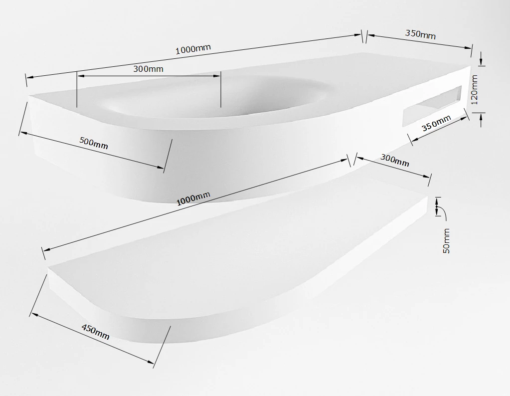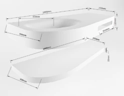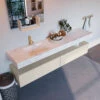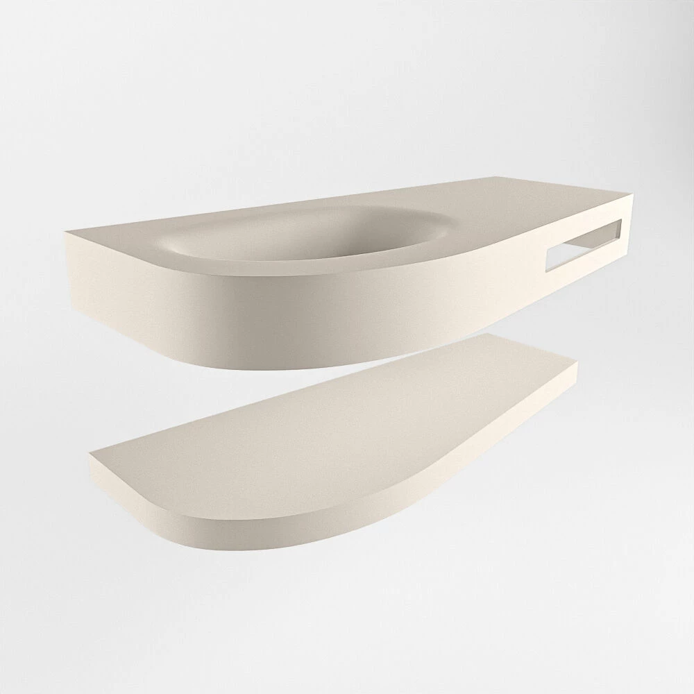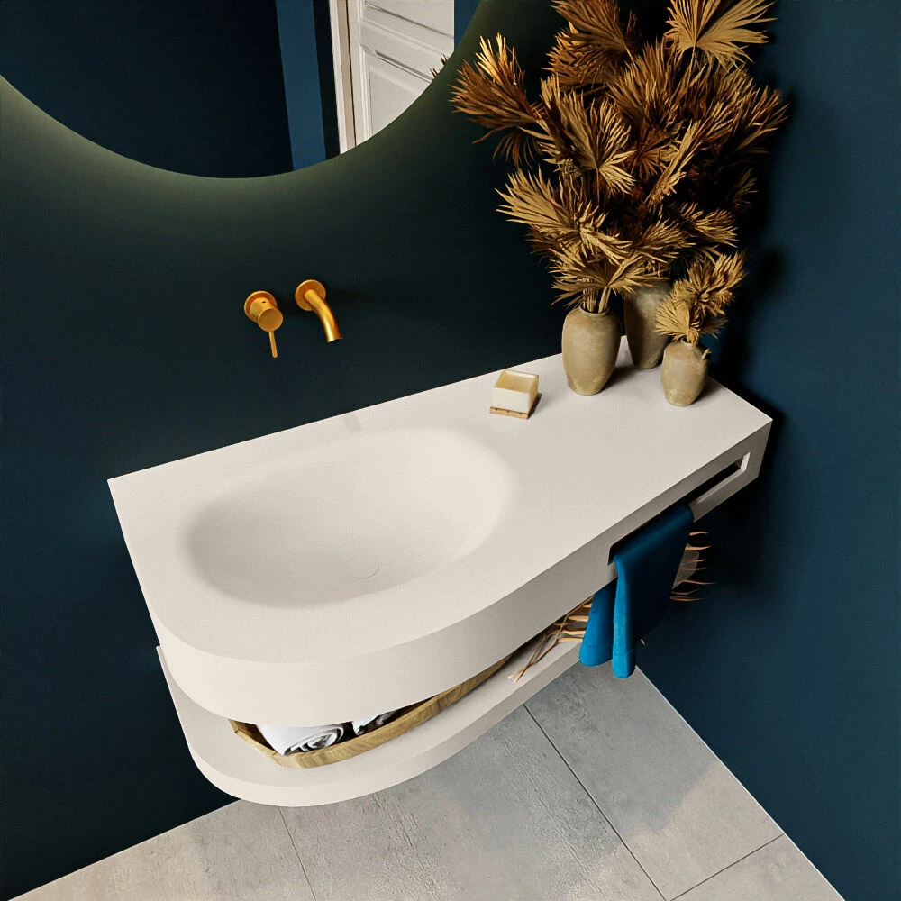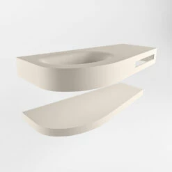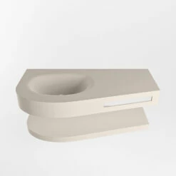 Het badmeubel Riva is oprecht “hotel chique” te noemen. Deze set staat niet alleen mooi in een luxe hotelkamer maar kan ook een fantastische blikvanger zijn in jouw badkamer. De speciale vorm van de wastafel en de geïntegreerde handdoek houder zorgen ervoor dat je ook in de kleinere badkamer kunt genieten van deze hotel chique uitstraling. Dit badmeubel is het Riva 100cm badkamermeubel met onderkast in de kleur Linen. Het Riva badmeubel heeft een vrij hangende onderkast met 1 lade waarin voldoende ruimte is voor jouw badkamerspulletjes. Het solid surface planchet heeft dezelfde toelopende vorm als de wastafel. Het planchet geeft jou de ruimte om mooie badkamer producten te laten zien.