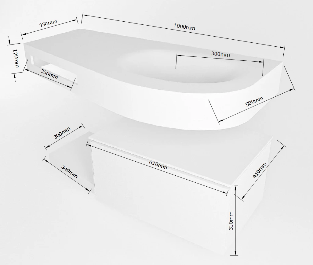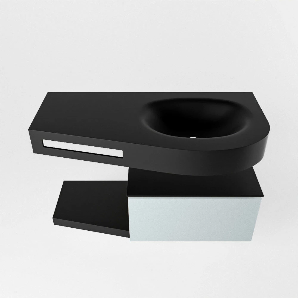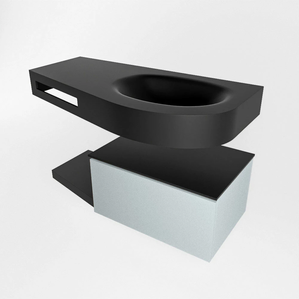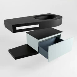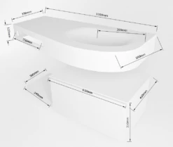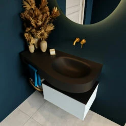 Het badmeubel Riva is oprecht “hotel chique” te noemen. Deze set staat niet alleen mooi in een luxe hotelkamer maar kan ook een fantastische blikvanger zijn in jouw badkamer. De speciale vorm van de wastafel en de geïntegreerde handdoek houder zorgen ervoor dat je ook in de kleinere badkamer kunt genieten van deze hotel chique uitstraling. Dit badmeubel is het Riva 100cm badkamermeubel met onderkast in de kleur Clay. Het Riva badmeubel heeft een vrij hangende onderkast met 1 lade waarin voldoende ruimte is voor jouw badkamerspulletjes. Het solid surface planchet heeft dezelfde toelopende vorm als de wastafel. Het planchet geeft jou de ruimte om mooie badkamer producten te laten zien.