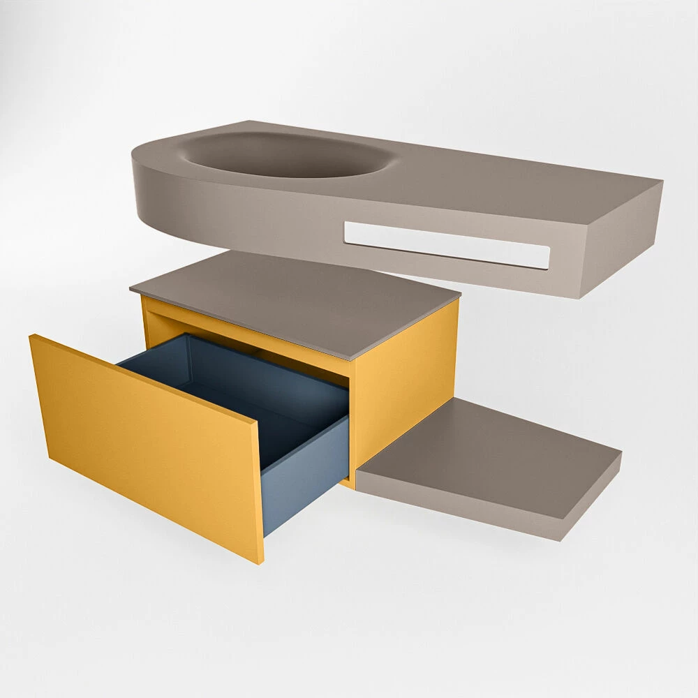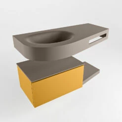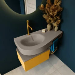 Het badmeubel Riva is oprecht “hotel chique” te noemen. Deze set staat niet alleen mooi in een luxe hotelkamer maar kan ook een fantastische blikvanger zijn in jouw badkamer. De speciale vorm van de wastafel en de geïntegreerde handdoek houder zorgen ervoor dat je ook in de kleinere badkamer kunt genieten van deze hotel chique uitstraling. Dit badmeubel is het Riva 100cm badkamermeubel met onderkast in de kleur Ocher. Het Riva badmeubel heeft een vrij hangende onderkast met 1 lade waarin voldoende ruimte is voor jouw badkamerspulletjes. Het solid surface planchet heeft dezelfde toelopende vorm als de wastafel. Het planchet geeft jou de ruimte om mooie badkamer producten te laten zien.