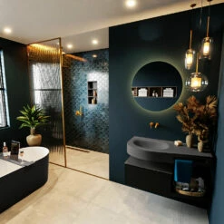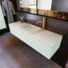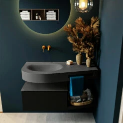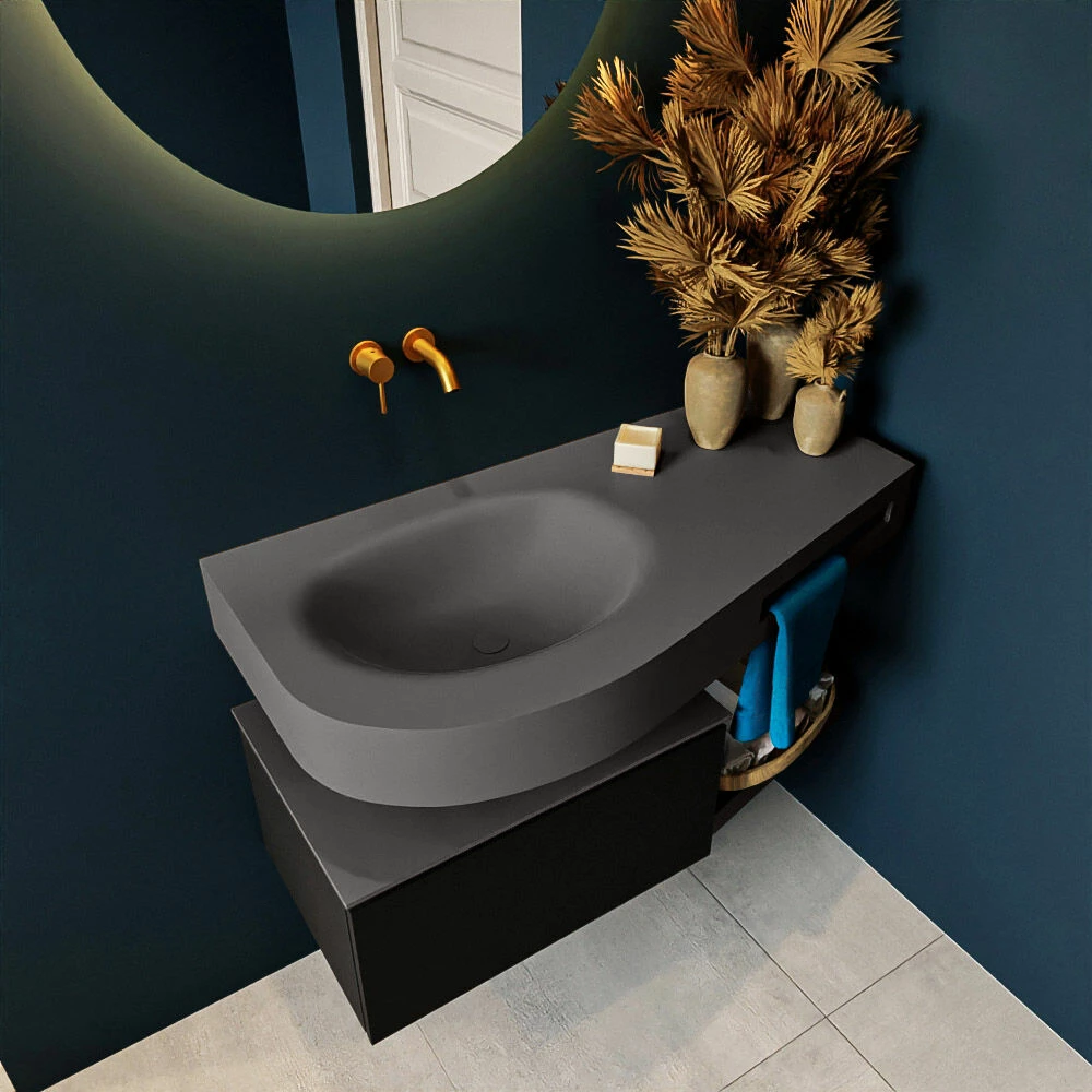 Het badmeubel Riva is oprecht “hotel chique” te noemen. Deze set staat niet alleen mooi in een luxe hotelkamer maar kan ook een fantastische blikvanger zijn in jouw badkamer. De speciale vorm van de wastafel en de geïntegreerde handdoek houder zorgen ervoor dat je ook in de kleinere badkamer kunt genieten van deze hotel chique uitstraling. Dit badmeubel is het Riva 100cm badkamermeubel met onderkast in de kleur Urban. Het Riva badmeubel heeft een vrij hangende onderkast met 1 lade waarin voldoende ruimte is voor jouw badkamerspulletjes. Het solid surface planchet heeft dezelfde toelopende vorm als de wastafel. Het planchet geeft jou de ruimte om mooie badkamer producten te laten zien.