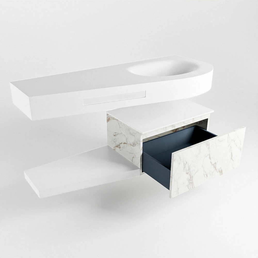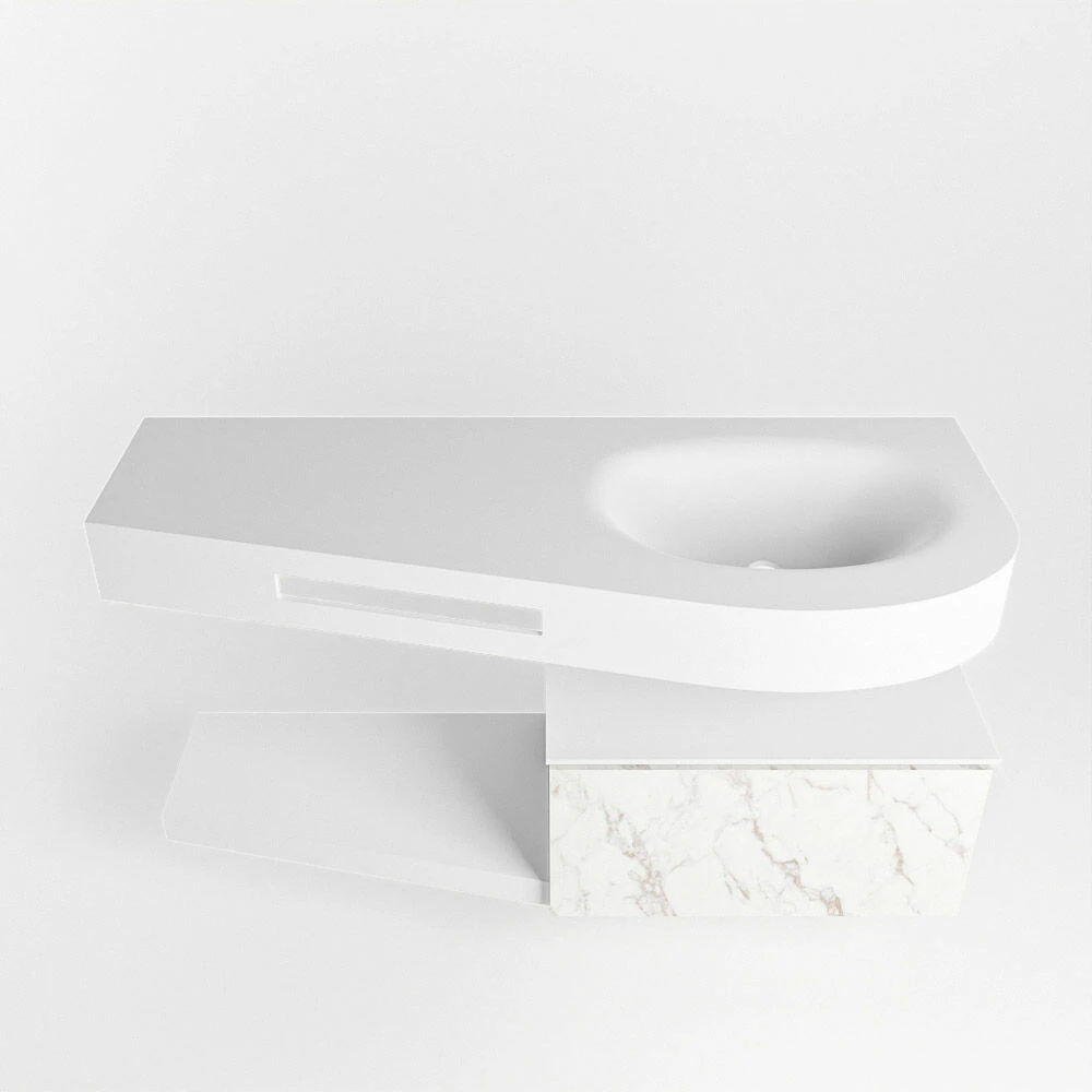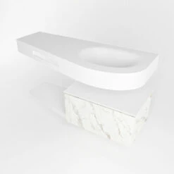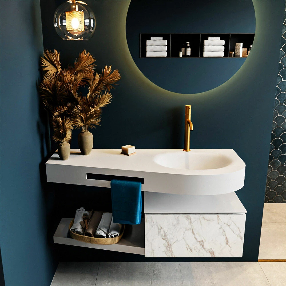 Het badmeubel Riva is oprecht “hotel chique” te noemen. Deze set staat niet alleen mooi in een luxe hotelkamer maar kan ook een fantastische blikvanger zijn in jouw badkamer. De speciale vorm van de wastafel en de geïntegreerde handdoek houder zorgen ervoor dat je ook in de kleinere badkamer kunt genieten van deze hotel chique uitstraling. Dit badmeubel is het Riva 120cm badkamermeubel met onderkast in de kleur Cararra. Het Riva badmeubel heeft een vrij hangende onderkast met 1 lade waarin voldoende ruimte is voor jouw badkamerspulletjes. Het solid surface planchet heeft dezelfde toelopende vorm als de wastafel. Het planchet geeft jou de ruimte om mooie badkamer producten te laten zien.