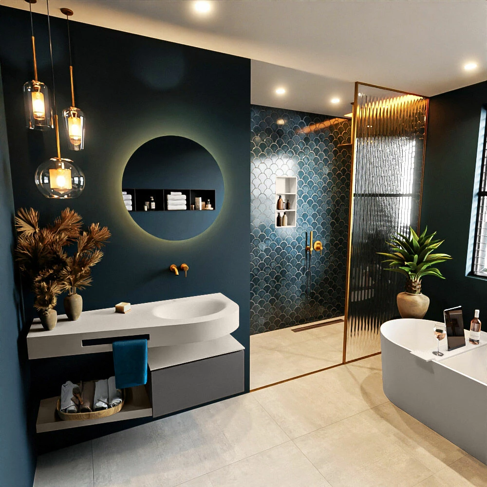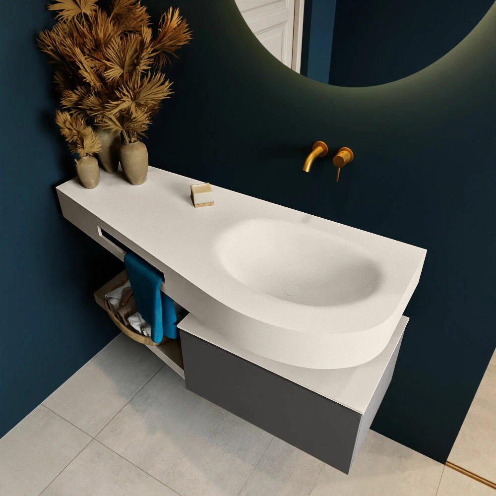 Het badmeubel Riva is oprecht “hotel chique” te noemen. Deze set staat niet alleen mooi in een luxe hotelkamer maar kan ook een fantastische blikvanger zijn in jouw badkamer. De speciale vorm van de wastafel en de geïntegreerde handdoek houder zorgen ervoor dat je ook in de kleinere badkamer kunt genieten van deze hotel chique uitstraling. Dit badmeubel is het Riva 120cm badkamermeubel met onderkast in de kleur Dark Grey. Het Riva badmeubel heeft een vrij hangende onderkast met 1 lade waarin voldoende ruimte is voor jouw badkamerspulletjes. Het solid surface planchet heeft dezelfde toelopende vorm als de wastafel. Het planchet geeft jou de ruimte om mooie badkamer producten te laten zien.
