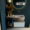 Het badmeubel Riva is oprecht “hotel chique” te noemen. Deze set staat niet alleen mooi in een luxe hotelkamer maar kan ook een fantastische blikvanger zijn in jouw badkamer. De speciale vorm van de wastafel en de geïntegreerde handdoek houder zorgen ervoor dat je ook in de kleinere badkamer kunt genieten van deze hotel chique uitstraling. Dit badmeubel is het Riva 120cm badkamermeubel met onderkast in de kleur Light Brown Grey. Het Riva badmeubel heeft een vrij hangende onderkast met 1 lade waarin voldoende ruimte is voor jouw badkamerspulletjes. Het solid surface planchet heeft dezelfde toelopende vorm als de wastafel. Het planchet geeft jou de ruimte om mooie badkamer producten te laten zien.