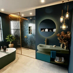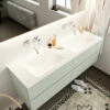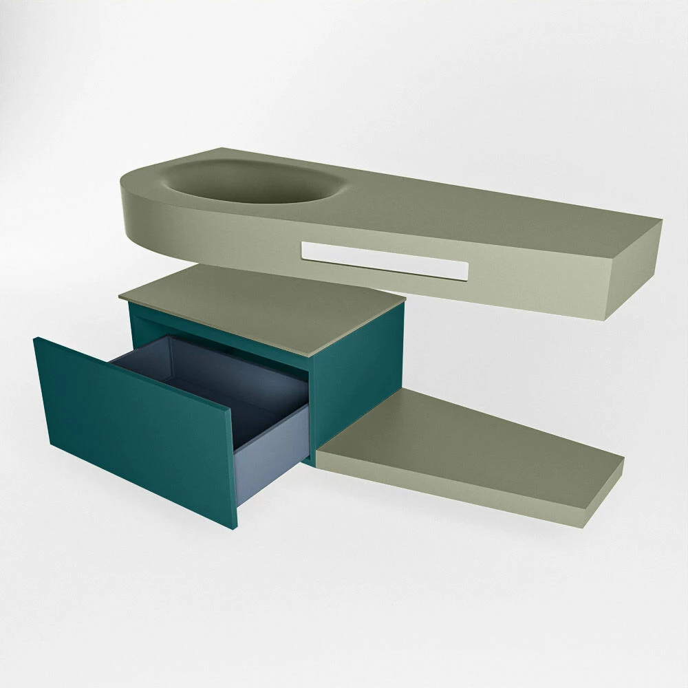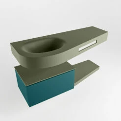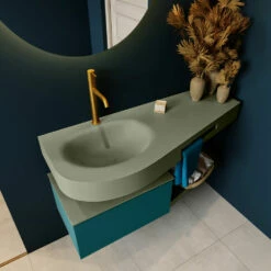 Het badmeubel Riva is oprecht “hotel chique” te noemen. Deze set staat niet alleen mooi in een luxe hotelkamer maar kan ook een fantastische blikvanger zijn in jouw badkamer. De speciale vorm van de wastafel en de geïntegreerde handdoek houder zorgen ervoor dat je ook in de kleinere badkamer kunt genieten van deze hotel chique uitstraling. Dit badmeubel is het Riva 120cm badkamermeubel met onderkast in de kleur Smag. Het Riva badmeubel heeft een vrij hangende onderkast met 1 lade waarin voldoende ruimte is voor jouw badkamerspulletjes. Het solid surface planchet heeft dezelfde toelopende vorm als de wastafel. Het planchet geeft jou de ruimte om mooie badkamer producten te laten zien.
