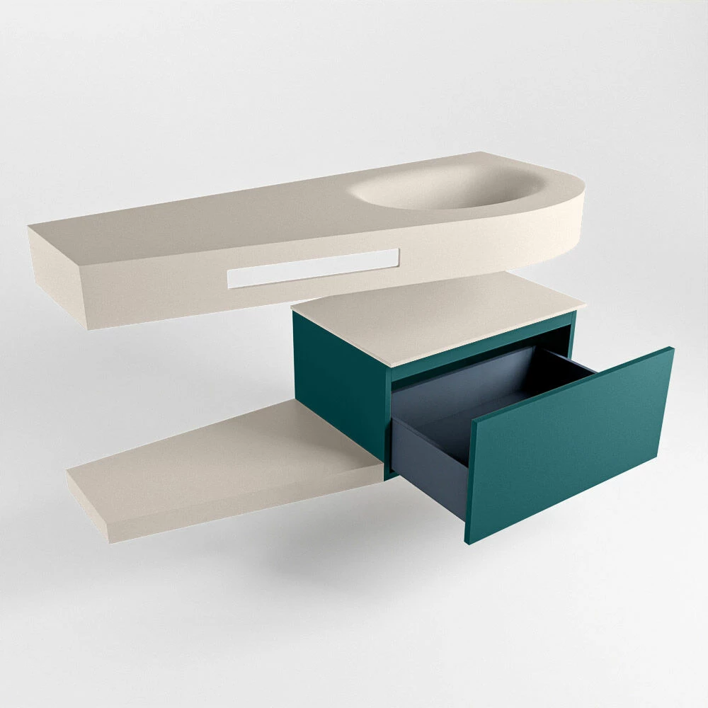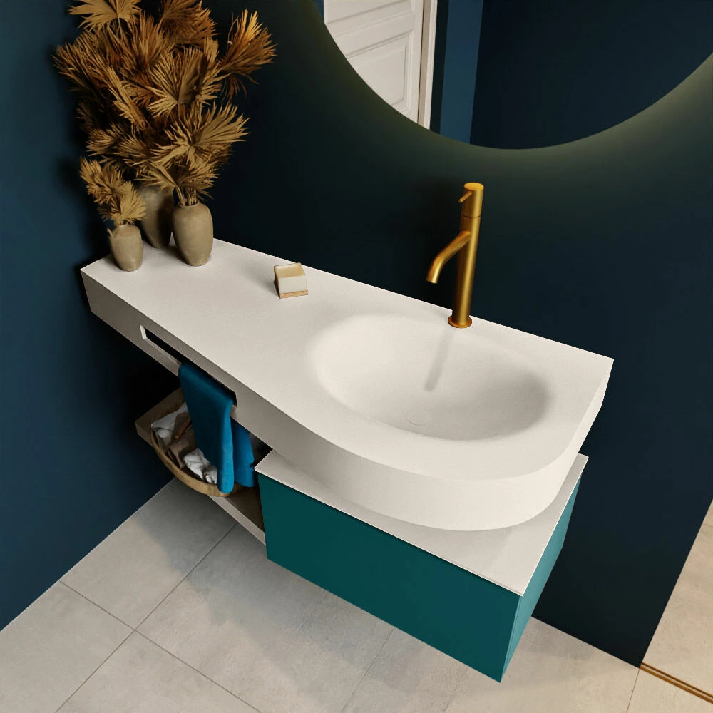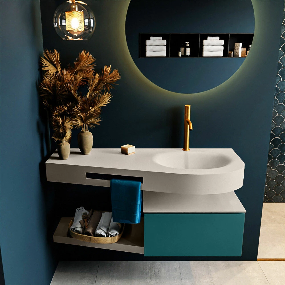 Het badmeubel Riva is oprecht “hotel chique” te noemen. Deze set staat niet alleen mooi in een luxe hotelkamer maar kan ook een fantastische blikvanger zijn in jouw badkamer. De speciale vorm van de wastafel en de geïntegreerde handdoek houder zorgen ervoor dat je ook in de kleinere badkamer kunt genieten van deze hotel chique uitstraling. Dit badmeubel is het Riva 120cm badkamermeubel met onderkast in de kleur Smag. Het Riva badmeubel heeft een vrij hangende onderkast met 1 lade waarin voldoende ruimte is voor jouw badkamerspulletjes. Het solid surface planchet heeft dezelfde toelopende vorm als de wastafel. Het planchet geeft jou de ruimte om mooie badkamer producten te laten zien.