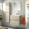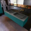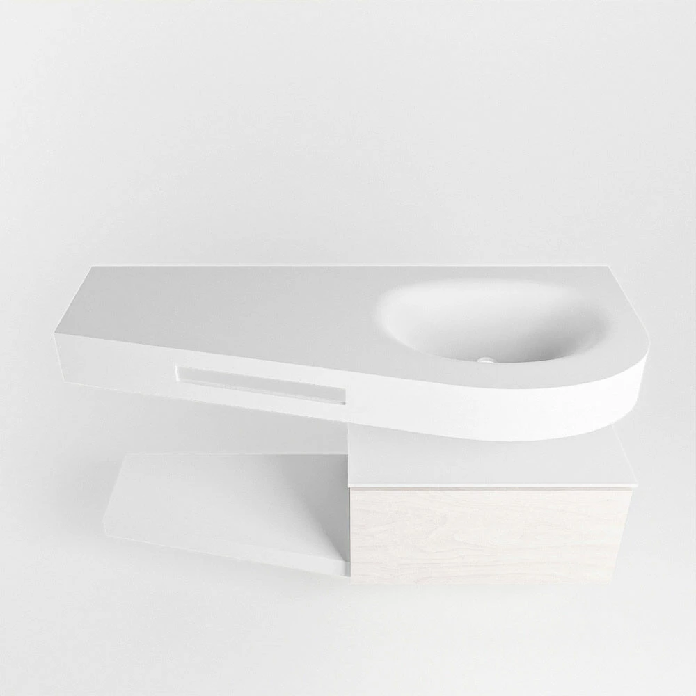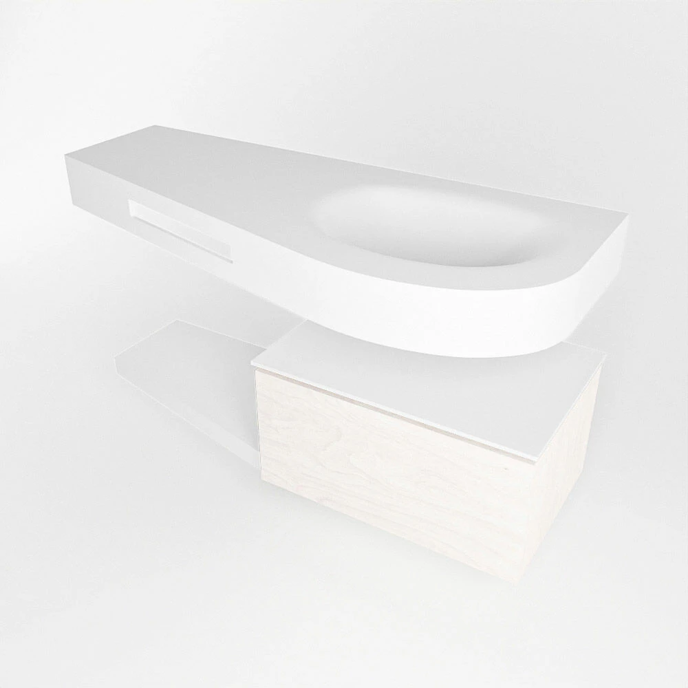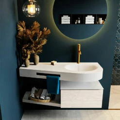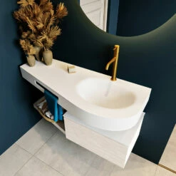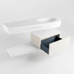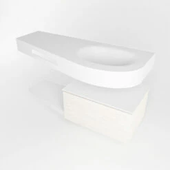 Het badmeubel Riva is oprecht “hotel chique” te noemen. Deze set staat niet alleen mooi in een luxe hotelkamer maar kan ook een fantastische blikvanger zijn in jouw badkamer. De speciale vorm van de wastafel en de geïntegreerde handdoek houder zorgen ervoor dat je ook in de kleinere badkamer kunt genieten van deze hotel chique uitstraling. Dit badmeubel is het Riva 120cm badkamermeubel met onderkast in de kleur Underlayment. Het Riva badmeubel heeft een vrij hangende onderkast met 1 lade waarin voldoende ruimte is voor jouw badkamerspulletjes. Het solid surface planchet heeft dezelfde toelopende vorm als de wastafel. Het planchet geeft jou de ruimte om mooie badkamer producten te laten zien.