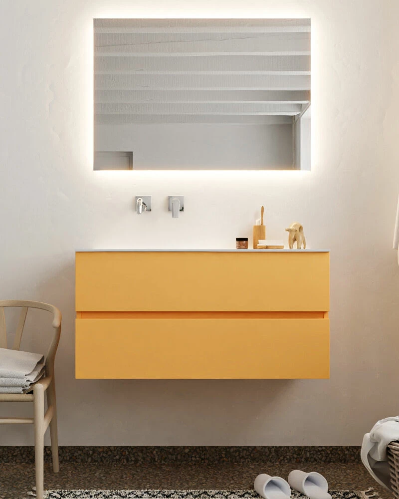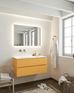 Dit prachtige hangende badkamermeubel van Mondiaz beschikt over een onderkast in de kleur ocher met een wastafel van solid surface. De wastafel wordt geleverd met 0 kraangaten.